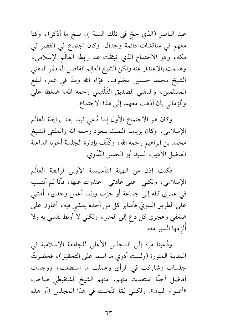 عبدالناصر (الذي حجّ في تلك السنة إن صحّ ما أذكر)، وكنا معهم في مناقشات دائمة وجدال. وكان اجتماع في القصر في مكة، وهو الاجتماع الذي انبثقَت عنه رابطة العالَم الإسلامي، وهممت بالاعتذار عنه ولكن الشيخ العالِم الفاضل المعمَّر المفتي الشيخ محمد حسنين مخلوف، قوّاه الله ومدّ في عمره لنفع المسلمين، والمفتي الصديق القَلْقيلي رحمه الله، ضغطا عليّ وألزماني بأن أذهب معهما إلى هذا الاجتماع.