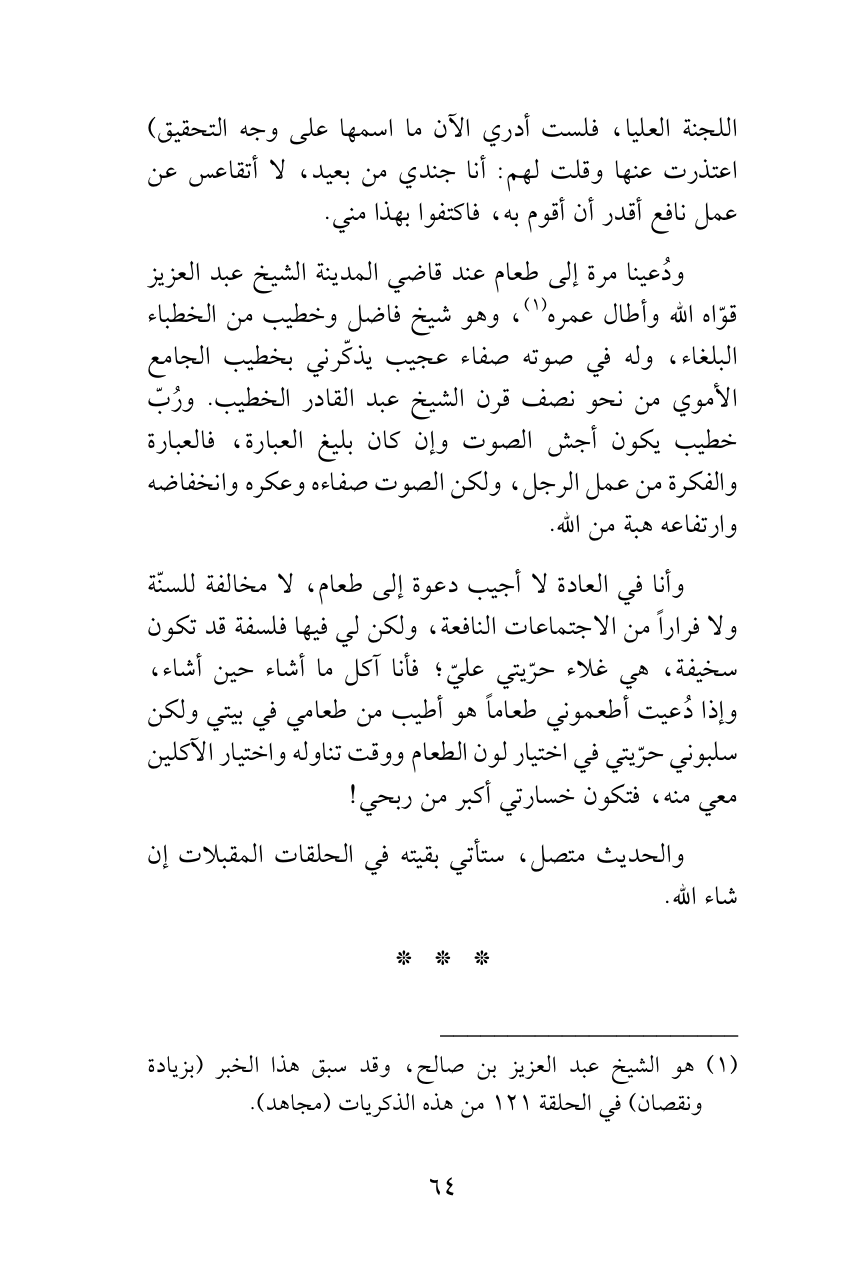 وأنا في العادة لا أجيب دعوة إلى طعام، لا مخالفة للسنّة ولا فراراً من الاجتماعات النافعة، ولكن لي فيها فلسفة قد تكون سخيفة، هي غلاء حرّيتي عليّ؛ فأنا آكل ما أشاء حين أشاء، وإذا دُعيت أطعموني طعاماً هو أطيب من طعامي في بيتي ولكن سلبوني حرّيتي في اختيار لون الطعام ووقت تناوله واختيار الآكلين معي منه، فتكون خسارتي أكبر من ربحي!