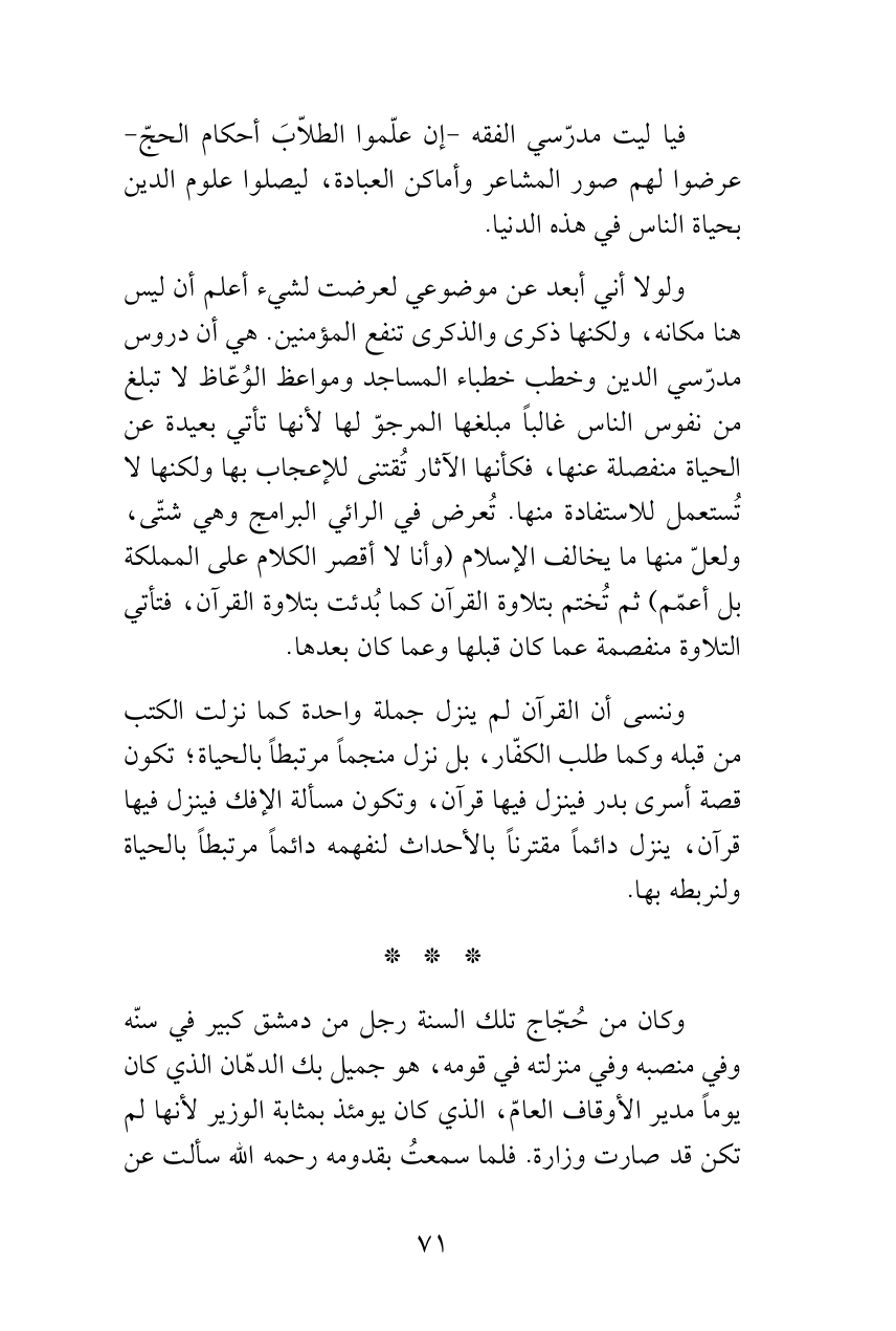 ولولا أني أبعد عن موضوعي لعرضت لشيء أعلم أن ليس هنا مكانه، ولكنها ذكرى والذكرى تنفع المؤمنين. هي أن دروس مدرّسي الدين وخطب خطباء المساجد ومواعظ الوُعّاظ لا تبلغ من نفوس الناس غالباً مبلغها المرجوّ لها لأنها تأتي بعيدة عن الحياة منفصلة عنها، فكأنها الآثار تُقتنى للإعجاب بها ولكنها لا تُستعمل للاستفادة منها. تُعرض في الرائي البرامج وهي شتّى، ولعلّ منها ما يخالف الإسلام (وأنا لا أقصر الكلام على المملكة بل أعمّم) ثم تُختم بتلاوة القرآن كما بُدئت بتلاوة القرآن، فتأتي التلاوة منفصمة عما كان قبلها وعما كان بعدها.