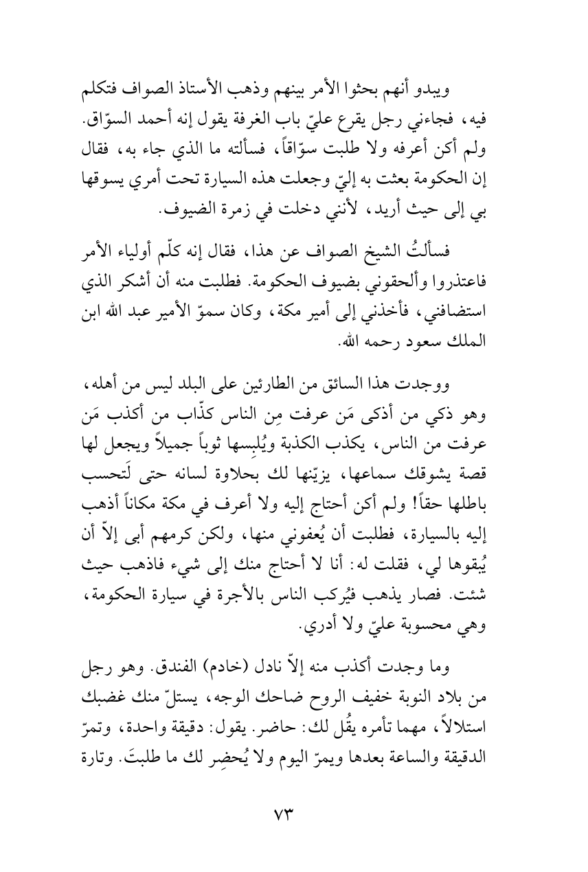 ووجدت هذا السائق من الطارئين على البلد ليس من أهله، وهو ذكي من أذكى مَن عرفت مِن الناس كذّاب من أكذب مَن عرفت من الناس، يكذب الكذبة ويُلبِسها ثوباً جميلاً ويجعل لها قصة يشوقك سماعها، يزيّنها لك بحلاوة لسانه حتى لَتحسب باطلها حقاً! ولم أكن أحتاج إليه ولا أعرف في مكة مكاناً أذهب إليه بالسيارة، فطلبت أن يُعفوني منها، ولكن كرمهم أبى إلاّ أن يُبقوها لي، فقلت له: أنا لا أحتاج منك إلى شيء فاذهب حيث شئت. فصار يذهب فيُركب الناس بالأجرة في سيارة الحكومة، وهي محسوبة عليّ ولا أدري.