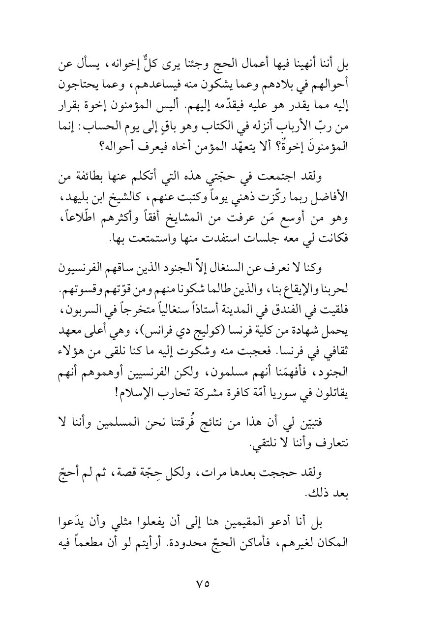 وكنا لا نعرف عن السنغال إلاّ الجنود الذين ساقهم الفرنسيون لحربنا والإيقاع بنا، والذين طالما شكونا منهم ومن قوّتهم وقسوتهم. فلقيت في الفندق في المدينة أستاذاً سنغالياً متخرجاً في السربون، يحمل شهادة من كلية فرنسا (كوليج دي فرانس)، وهي أعلى معهد ثقافي في فرنسا. فعجبت منه وشكوت إليه ما كنا نلقى من هؤلاء الجنود، فأفهمَنا أنهم مسلمون، ولكن الفرنسيين أوهموهم أنهم يقاتلون في سوريا أمّة كافرة مشركة تحارب الإسلام!