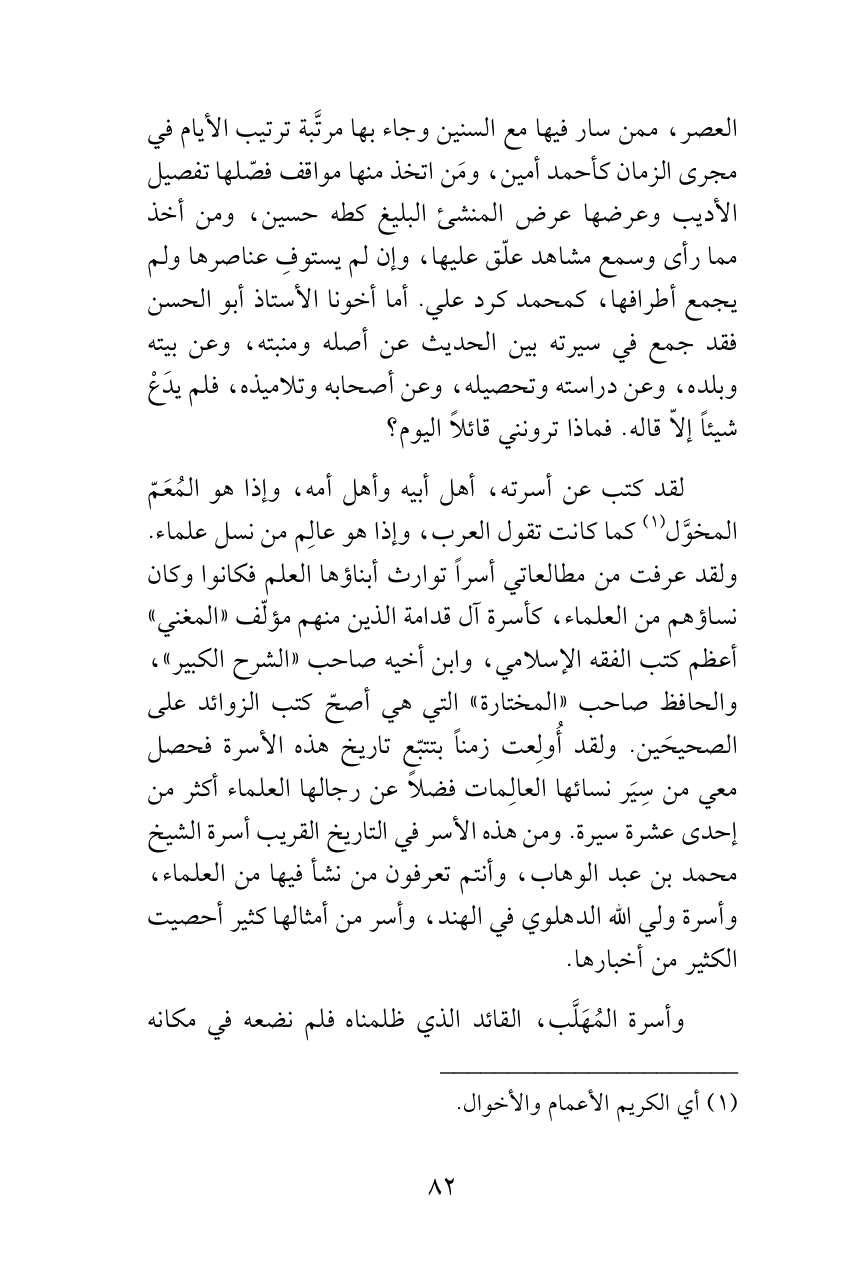 لقد كتب عن أسرته، أهل أبيه وأهل أمه، وإذا هو المُعَمّ المخوَّل (¬1) كما كانت تقول العرب، وإذا هو عالِم من نسل علماء. ولقد عرفت من مطالعاتي أسراً توارث أبناؤها العلم فكانوا وكان نساؤهم من العلماء، كأسرة آل قدامة الذين منهم مؤلّف «المغني» أعظم كتب الفقه الإسلامي، وابن أخيه صاحب «الشرح الكبير»، والحافظ صاحب «المختارة» التي هي أصحّ كتب الزوائد على الصحيحَين. ولقد أُولِعت زمناً بتتبّع تاريخ هذه الأسرة فحصل معي من سِيَر نسائها العالِمات فضلاً عن رجالها العلماء أكثر من إحدى عشرة سيرة. ومن هذه الأسر في التاريخ القريب أسرة الشيخ محمد بن عبد الوهاب، وأنتم تعرفون من نشأ فيها من العلماء، وأسرة ولي الله الدهلوي في الهند، وأسر من أمثالها كثير أحصيت الكثير من أخبارها.