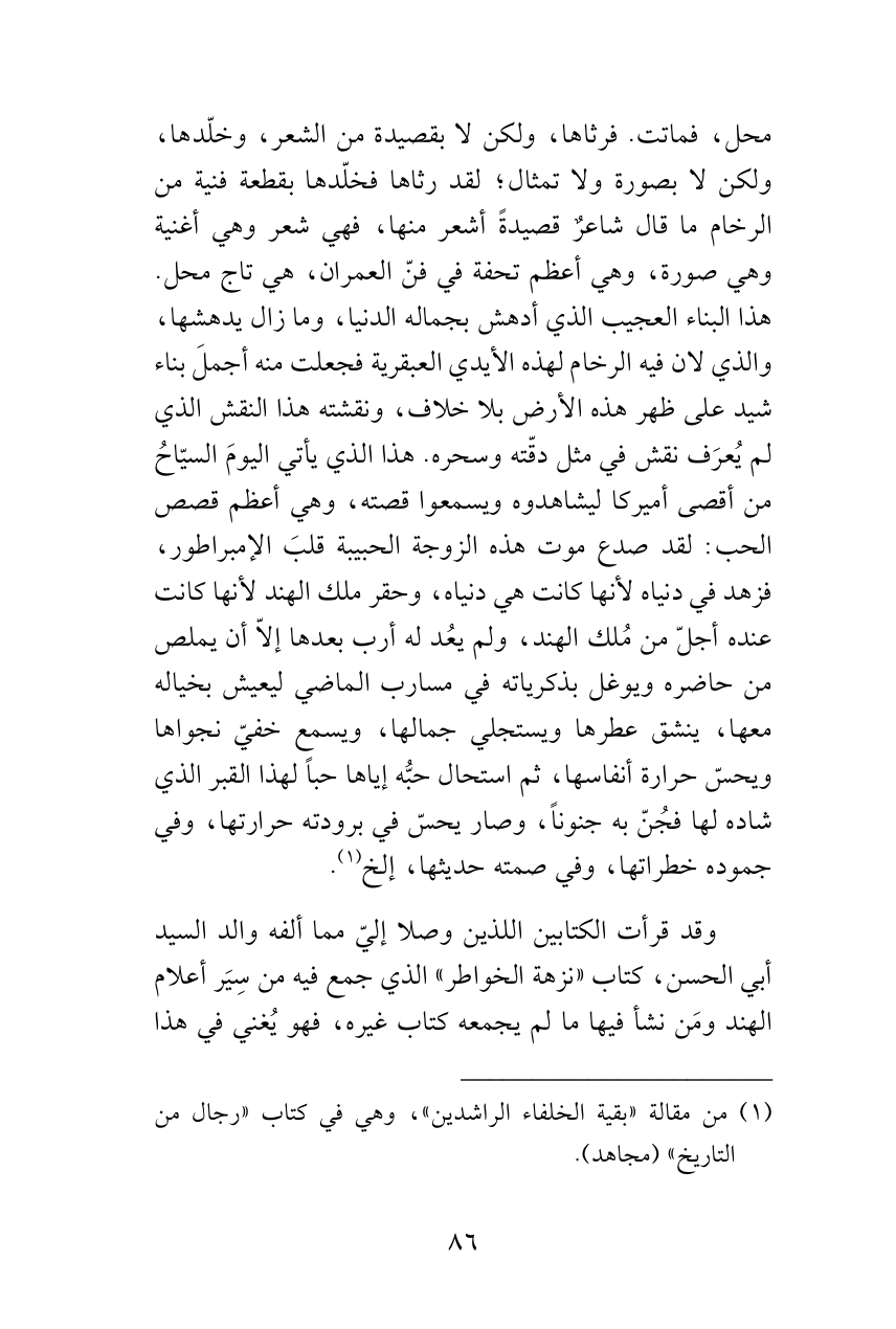 محل، فماتت. فرثاها، ولكن لا بقصيدة من الشعر، وخلّدها، ولكن لا بصورة ولا تمثال؛ لقد رثاها فخلّدها بقطعة فنية من الرخام ما قال شاعرٌ قصيدةً أشعر منها، فهي شعر وهي أغنية وهي صورة، وهي أعظم تحفة في فنّ العمران، هي تاج محل. هذا البناء العجيب الذي أدهش بجماله الدنيا، وما زال يدهشها، والذي لان فيه الرخام لهذه الأيدي العبقرية فجعلت منه أجملَ بناء شيد على ظهر هذه الأرض بلا خلاف، ونقشته هذا النقش الذي لم يُعرَف نقش في مثل دقّته وسحره. هذا الذي يأتي اليومَ السيّاحُ من أقصى أميركا ليشاهدوه ويسمعوا قصته، وهي أعظم قصص الحب: لقد صدع موت هذه الزوجة الحبيبة قلبَ الإمبراطور، فزهد في دنياه لأنها كانت هي دنياه، وحقر ملك الهند لأنها كانت عنده أجلّ من مُلك الهند، ولم يعُد له أرب بعدها إلاّ أن يملص من حاضره ويوغل بذكرياته في مسارب الماضي ليعيش بخياله معها، ينشق عطرها ويستجلي جمالها، ويسمع خفيّ نجواها ويحسّ حرارة أنفاسها، ثم استحال حبُّه إياها حباً لهذا القبر الذي شاده لها فجُنّ به جنوناً، وصار يحسّ في برودته حرارتها، وفي جموده خطراتها، وفي صمته حديثها، إلخ (¬1).