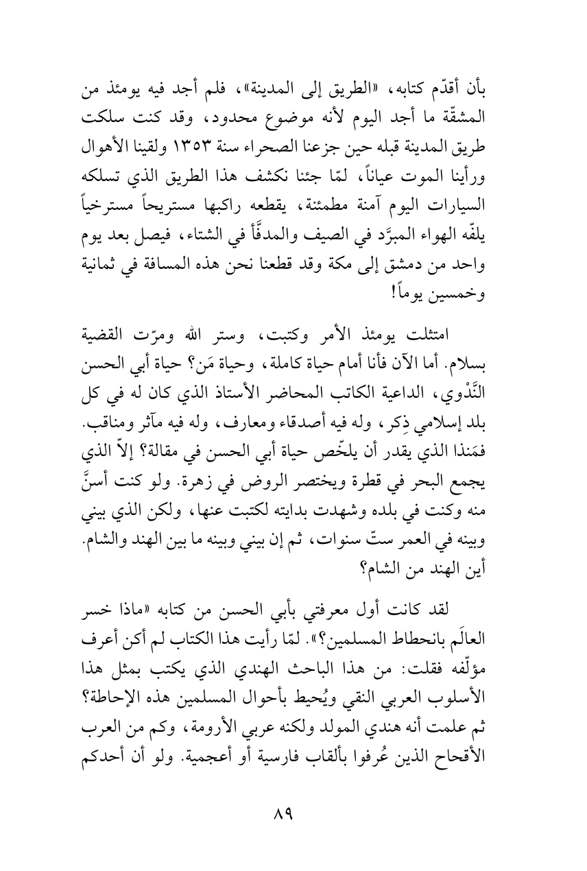 بأن أقدّم كتابه، «الطريق إلى المدينة»، فلم أجد فيه يومئذ من المشقّة ما أجد اليوم لأنه موضوع محدود، وقد كنت سلكت طريق المدينة قبله حين جزعنا الصحراء سنة 1353 ولقينا الأهوال ورأينا الموت عياناً، لمّا جئنا نكشف هذا الطريق الذي تسلكه السيارات اليوم آمنة مطمئنة، يقطعه راكبها مستريحاً مسترخياً يلفّه الهواء المبرَّد في الصيف والمدفَّأ في الشتاء، فيصل بعد يوم واحد من دمشق إلى مكة وقد قطعنا نحن هذه المسافة في ثمانية وخمسين يوماً!