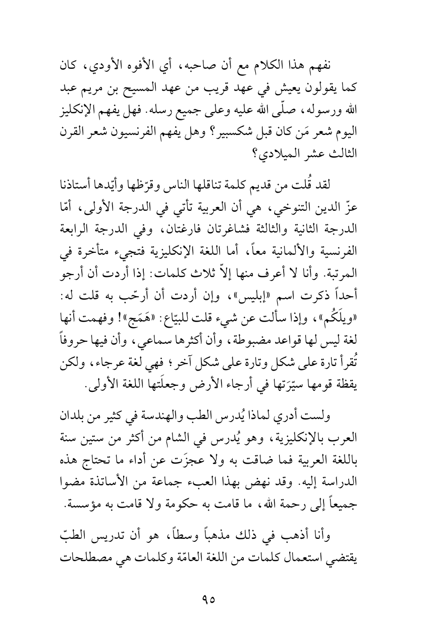 ولست أدري لماذا يُدرس الطب والهندسة في كثير من بلدان العرب بالإنكليزية، وهو يُدرس في الشام من أكثر من ستين سنة باللغة العربية فما ضاقت به ولا عجزَت عن أداء ما تحتاج هذه الدراسة إليه. وقد نهض بهذا العبء جماعة من الأساتذة مضوا جميعاً إلى رحمة الله، ما قامت به حكومة ولا قامت به مؤسسة.