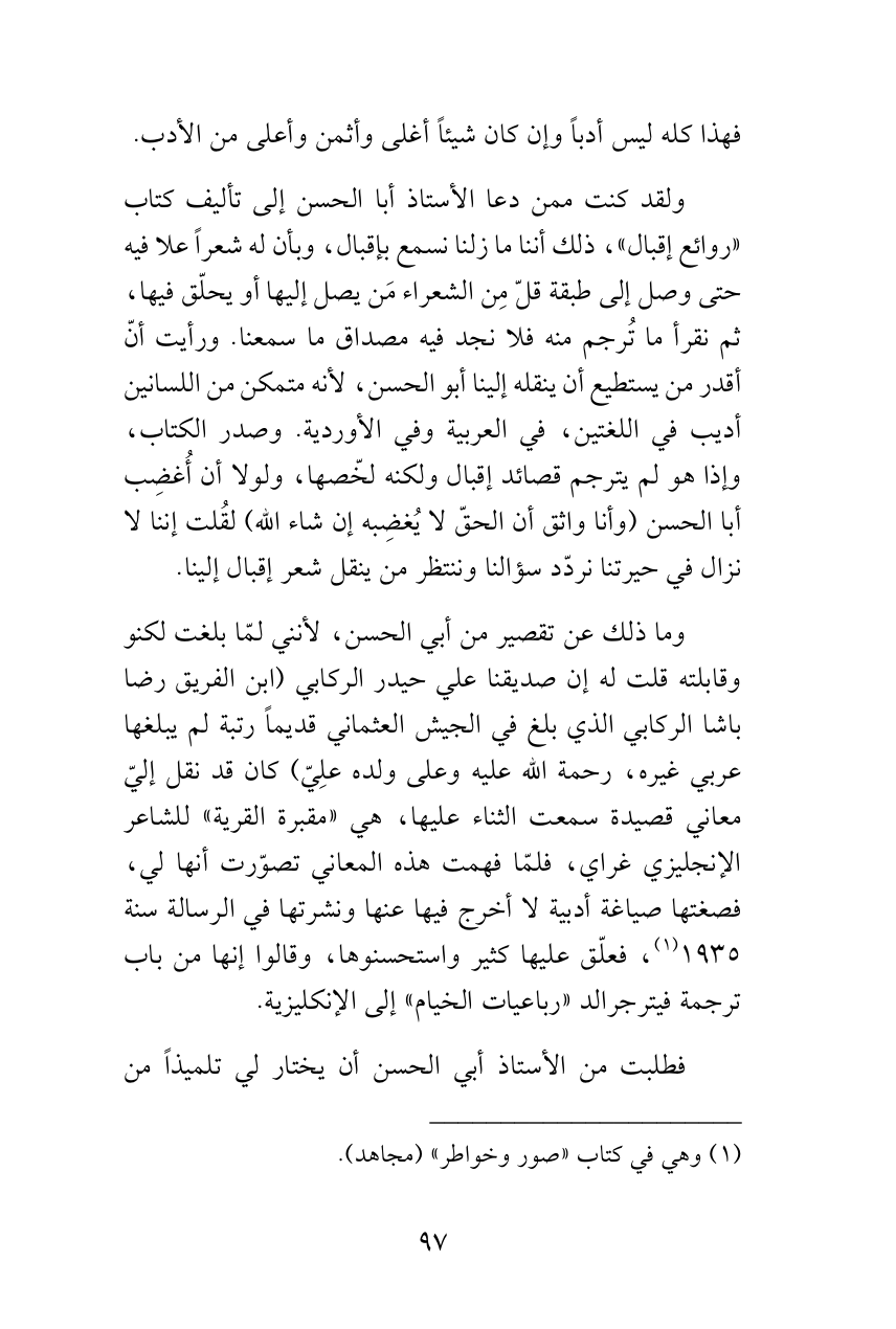 وما ذلك عن تقصير من أبي الحسن، لأنني لمّا بلغت لكنو وقابلته قلت له إن صديقنا علي حيدر الركابي (ابن الفريق رضا باشا الركابي الذي بلغ في الجيش العثماني قديماً رتبة لم يبلغها عربي غيره، رحمة الله عليه وعلى ولده علِيّ) كان قد نقل إليّ معاني قصيدة سمعت الثناء عليها، هي «مقبرة القرية» للشاعر الإنجليزي غراي، فلمّا فهمت هذه المعاني تصوّرت أنها لي، فصغتها صياغة أدبية لا أخرج فيها عنها ونشرتها في الرسالة سنة 1935 (¬1)، فعلّق عليها كثير واستحسنوها، وقالوا إنها من باب ترجمة فيترجرالد «رباعيات الخيام» إلى الإنكليزية.