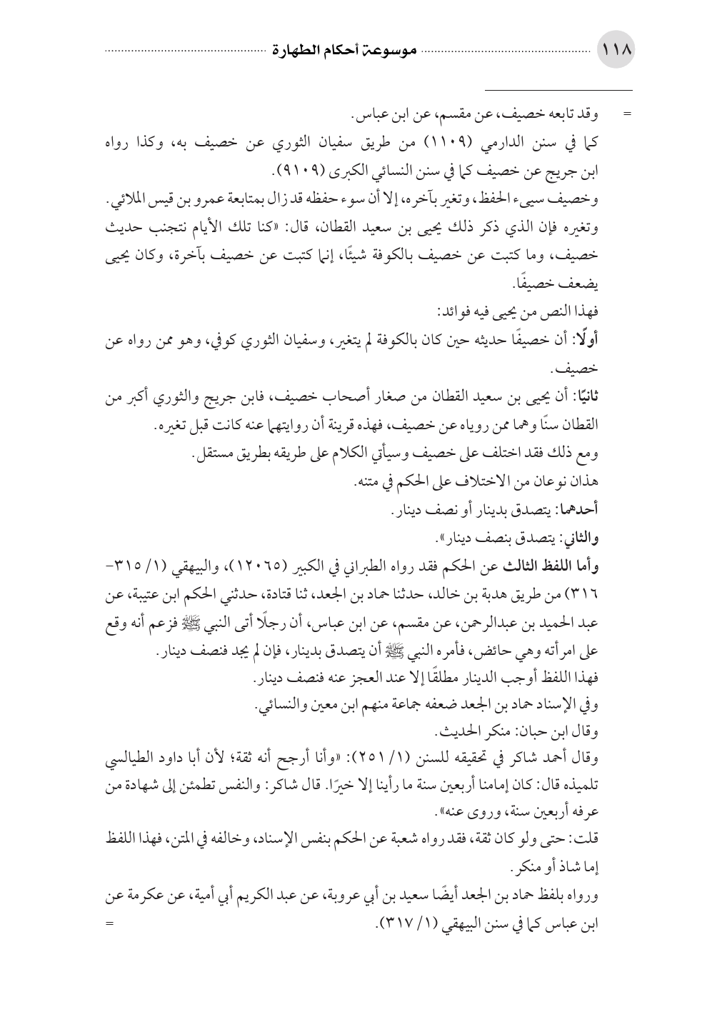 وأما اللفظ الثالث عن الحكم فقد رواه الطبراني في الكبير (١٢٠٦٥)، والبيهقي (١/ ٣١٥ - ٣١٦) من طريق هدبة بن خالد، حدثنا حماد بن الجعد، ثنا قتادة، حدثني الحكم ابن عتيبة، عن عبد الحميد بن عبدالرحمن، عن مقسم، عن ابن عباس، أن رجلًا أتى النبي صلى الله عليه وسلم فزعم أنه وقع على امرأته وهي حائض، فأمره النبي صلى الله عليه وسلم أن يتصدق بدينار، فإن لم يجد فنصف دينار.
