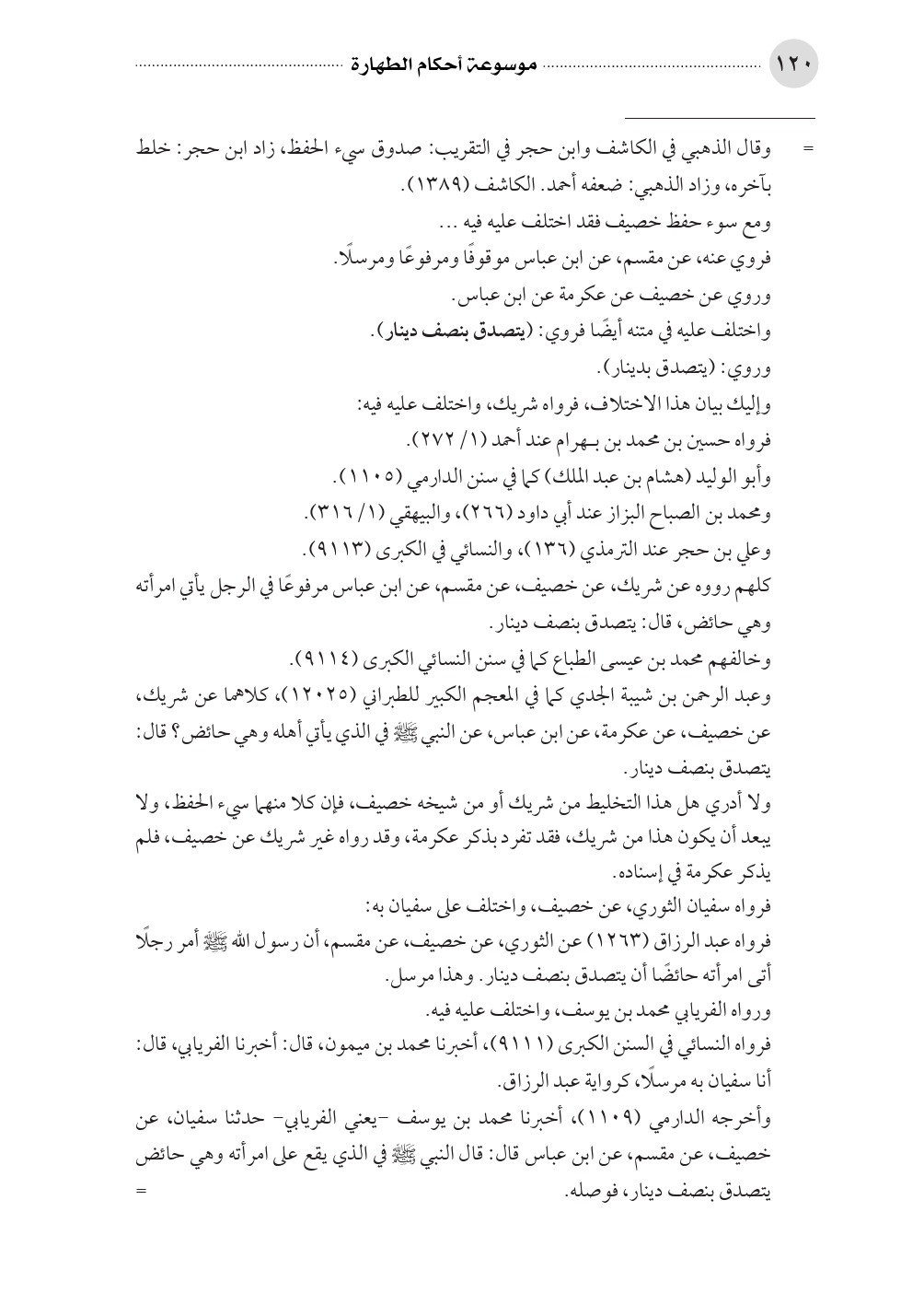 وأخرجه الدارمي (١١٠٩)، أخبرنا محمد بن يوسف -يعني الفريابي- حدثنا سفيان، عن خصيف، عن مقسم، عن ابن عباس قال: قال النبي صلى الله عليه وسلم في الذي يقع على امرأته وهي حائض يتصدق بنصف دينار، فوصله. =