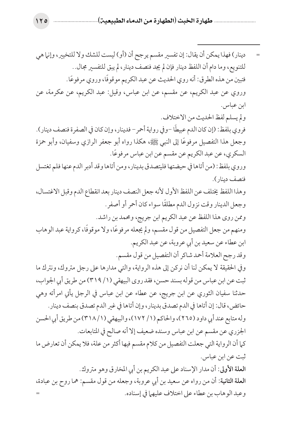 وفي الحقيقة لا يمكن لنا أن نركن إلى هذه الرواية، والتي مدارها على رجل متروك، ونترك ما ثبت عن ابن عباس من قوله بسند حسن، فقد روى البيهقي (١/ ٣١٩) من طريق أبي الجواب، حدثنا سفيان الثوري عن ابن جريج، عن عطاء عن ابن عباس في الرجل يأتي امرأته وهي حائض، قال: إن أتاها في الدم تصدق بدينار، وإن أتاها في غير الدم تصدق بنصف دينار.