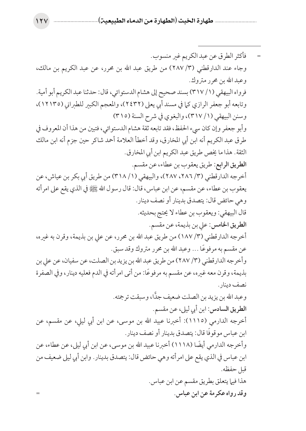 وأخرجه الدارمي أيضًا (١١١٨) أخبرنا عبيد الله بن موسى، عن ابن أبي ليلى، عن عطاء، عن ابن عباس في الذي يقع على امرأته وهي حائض قال: يتصدق بدينار. وابن أبي ليلى ضعيف من قبل حفظه.