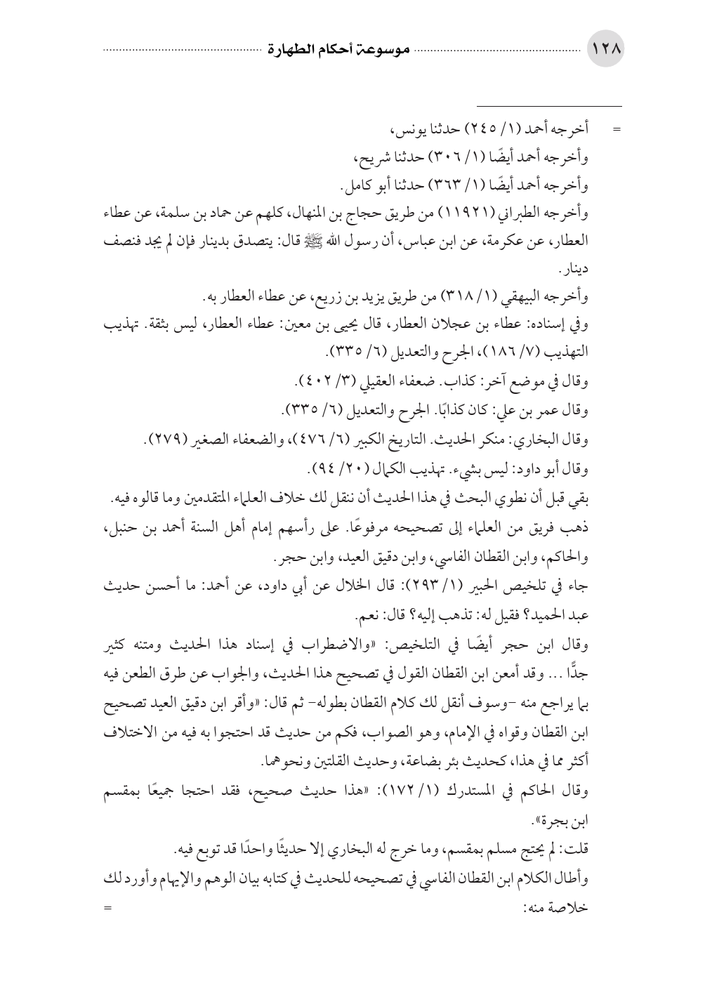 وأخرجه الطبراني (١١٩٢١) من طريق حجاج بن المنهال، كلهم عن حماد بن سلمة، عن عطاء العطار، عن عكرمة، عن ابن عباس، أن رسول الله صلى الله عليه وسلم قال: يتصدق بدينار فإن لم يجد فنصف دينار.