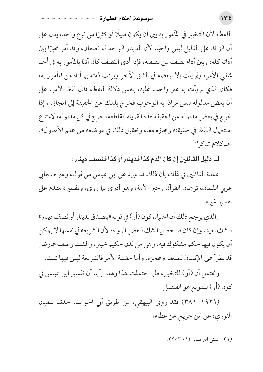 • دليل القائلين إن كان الدم كذا فدينار أو كذا فنصف دينار: