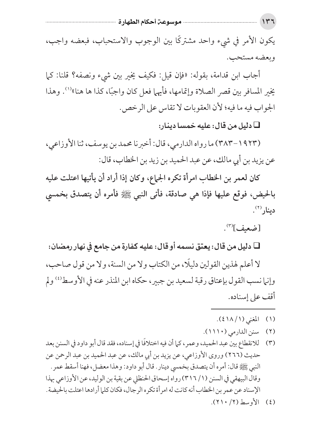 (¬٣) للانقطاع بين عبد الحميد، وعمر، كما أن فيه اختلافًا في إسناده، فقد قال أبو داود في السنن بعد حديث (٢٦٦) وروى الأوزاعي، عن يزيد بن أبي مالك، عن عبد الحميد بن عبد الرحمن عن النبي صلى الله عليه وسلم قال: أمره أن يتصدق بخمسي دينار. قال أبو داود: وهذا معضل، فهنا أسقط عمر.
