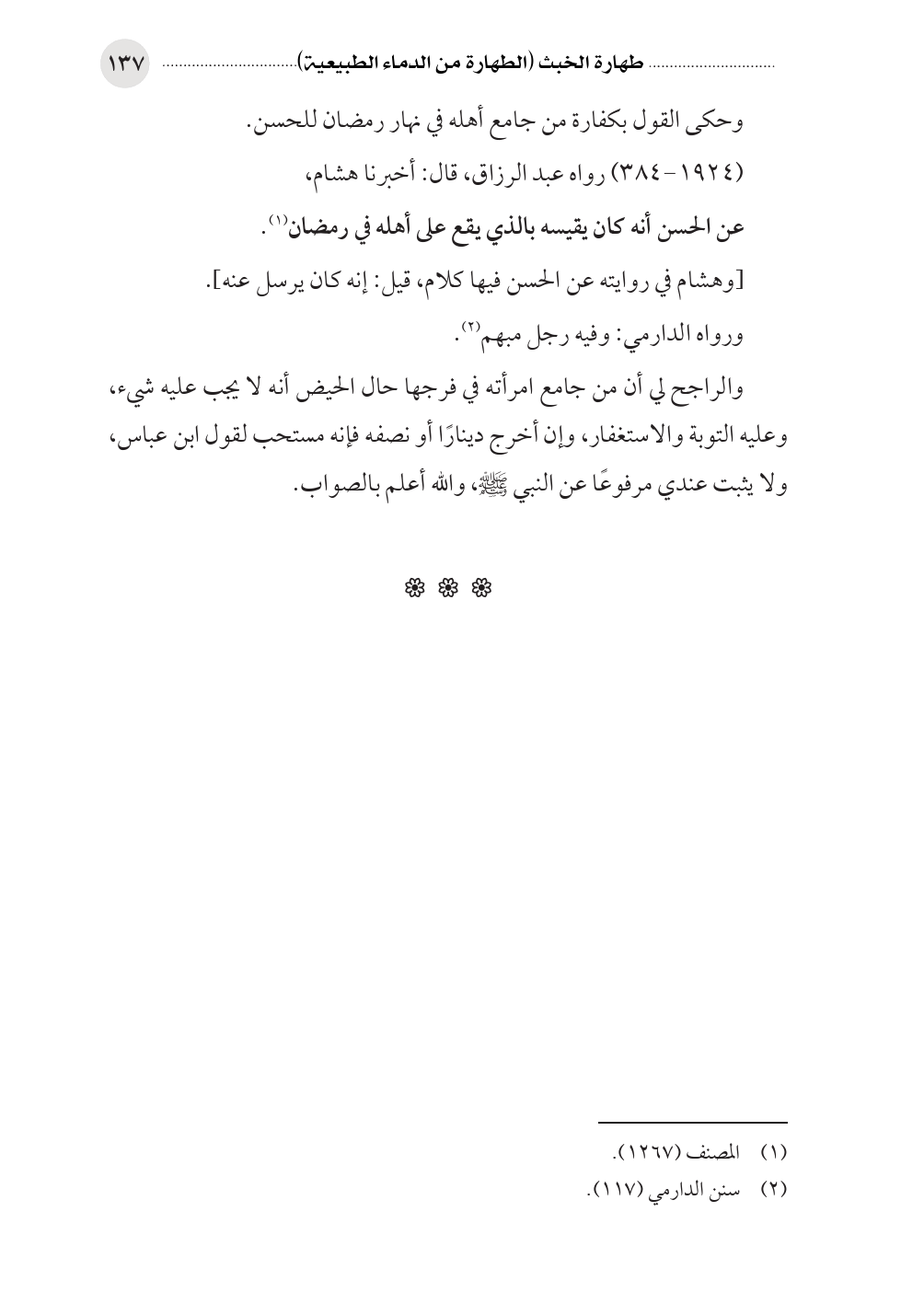 والراجح لي أن من جامع امرأته في فرجها حال الحيض أنه لا يجب عليه شيء، وعليه التوبة والاستغفار، وإن أخرج دينارًا أو نصفه فإنه مستحب لقول ابن عباس، ولا يثبت عندي مرفوعًا عن النبي صلى الله عليه وسلم، والله أعلم بالصواب.