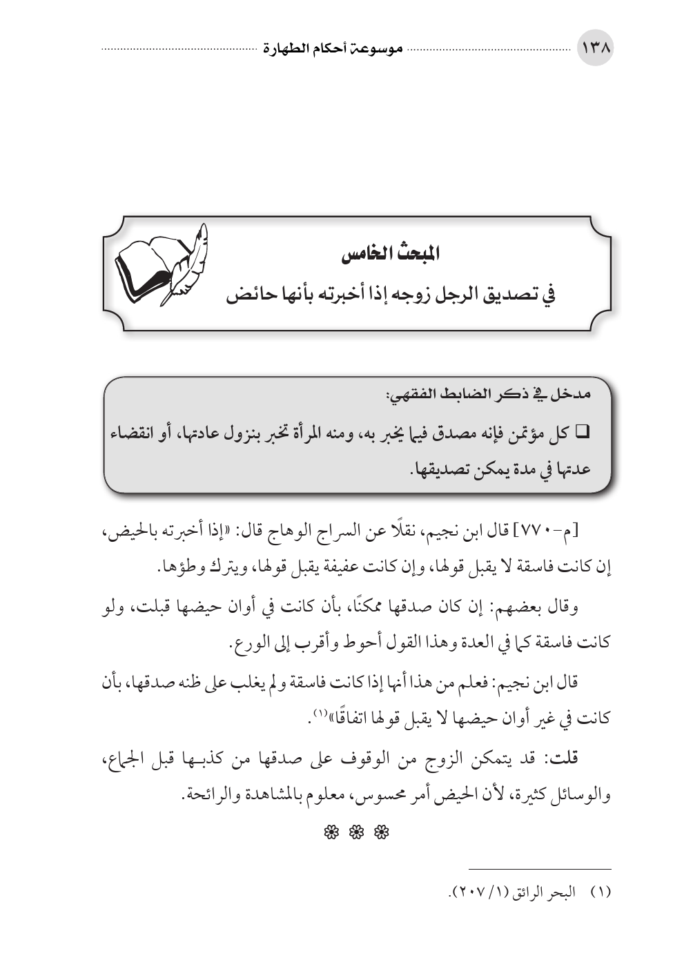 المبحث الخامس في تصديق الرجل زوجه إذا أخبرته بأنها حائض