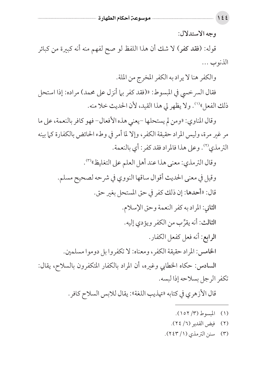 وقال المناوي: «ومن لم يستحلها -يعني هذه الأفعال- فهو كافر بالنعمة، على ما مر غير مرة، وليس المراد حقيقة الكفر، وإلا لما أمر في وطء الحائض بالكفارة كما بينه الترمذي (¬٢). وعلى هذا فالمراد فقد كفر: أي بالنعمة.