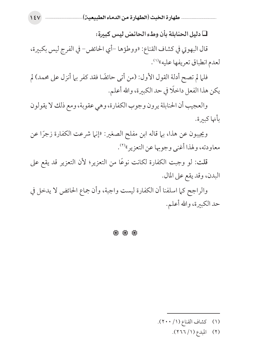 • دليل الحنابلة بأن وطء الحائض ليس كبيرة: