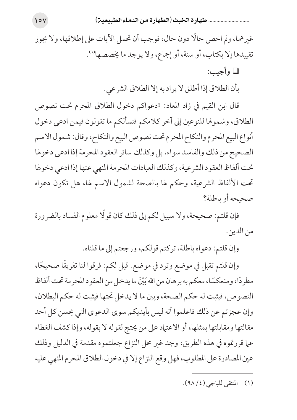 قال ابن القيم في زاد المعاد: «دعواكم دخول الطلاق المحرم تحت نصوص الطلاق، وشمولها للنوعين إلى آخر كلامكم فنسألكم ما تقولون فيمن ادعى دخول أنواع البيع المحرم والنكاح المحرم تحت نصوص البيع والنكاح، وقال: شمول الاسم الصحيح من ذلك والفاسد سواء، بل وكذلك سائر العقود المحرمة إذا ادعى دخولها تحت ألفاظ العقود الشرعية، وكذلك العبادات المحرمة المنهي عنها إذا ادعي دخولها تحت الألفاظ الشرعية، وحكم لها بالصحة لشمول الاسم لها، هل تكون دعواه صحيحه أو باطلة؟