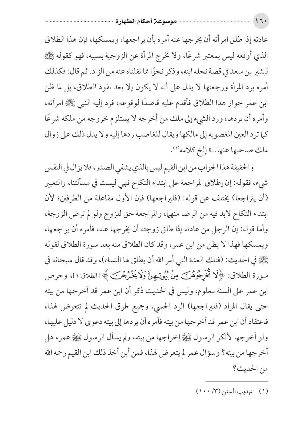 والحقيقة هذا الجواب من ابن القيم ليس بالذي يشفي الصدر، فلا يزال في النفس شيء، فقوله: إن إطلاق المراجعة على ابتداء النكاح فهي ليست في مسألتنا، والتعبير (أن يتراجعا) يختلف عن قوله: (فليراجعها) فإن الأول مفاعلة من الطرفين؛ لأن ابتداء النكاح لابد فيه من الرضا منهما، والمراجعة حق للزوج ولو لم ترض الزوجة، وأما قوله: إن الرجل من عادته إذا طلق زوجته أن يخرجها عنه، فأمره أن يراجعها، ويمسكها فهذا لا يظن من ابن عمر، وقد كان الطلاق منه بعد سورة الطلاق لقوله صلى الله عليه وسلم في الحديث: (فتلك العدة التي أمر الله أن يطلق لها النساء)، وقد قال سبحانه في سورة الطلاق: (لا تُخْرِجُوهُنَّ مِن بُيُوتِهِنَّ وَلا يَخْرُجْنَ) [الطلاق: ١]، وحرص ابن عمر على السنة معلوم، وليس في الحديث ذكر أن ابن عمر قد أخرجها من بيته حتى يقال المراد (فليراجعها) الرد الحسي، وجميع طرق الحديث لم تتعرض لهذا، فاعتقاد أن ابن عمر قد أخرجها من بيته فأمره أن يردها إلى بيته دعوى لا دليل عليها، ولو أخرجها لأنكر الرسول صلى الله عليه وسلم إخراجها من بيته، ولم يسأل الرسول صلى الله عليه وسلم عمر، هل أخرجها من بيته؟ وسؤال عمر لم يتعرض لهذا، فمن أين أخذ ذلك ابن القيم رحمه الله من الحديث؟