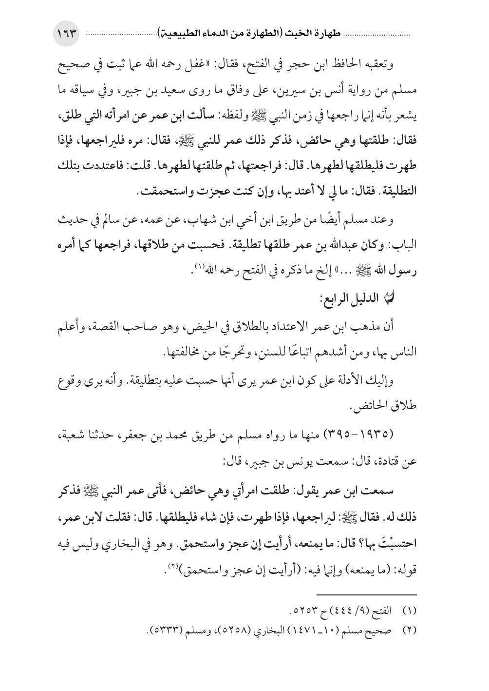 وتعقبه الحافظ ابن حجر في الفتح، فقال: «غفل رحمه الله عما ثبت في صحيح مسلم من رواية أنس بن سيرين، على وفاق ما روى سعيد بن جبير، وفي سياقه ما يشعر بأنه إنما راجعها في زمن النبي صلى الله عليه وسلم ولفظه: سألت ابن عمر عن امرأته التي طلق، فقال: طلقتها وهي حائض، فذكر ذلك عمر للنبي صلى الله عليه وسلم، فقال: مره فليراجعها، فإذا طهرت فليطلقها لطهرها. قال: فراجعتها، ثم طلقتها لطهرها. قلت: فاعتددت بتلك التطليقة. فقال: ما لي لا أعتد بها، وإن كنت عجزت واستحمقت.