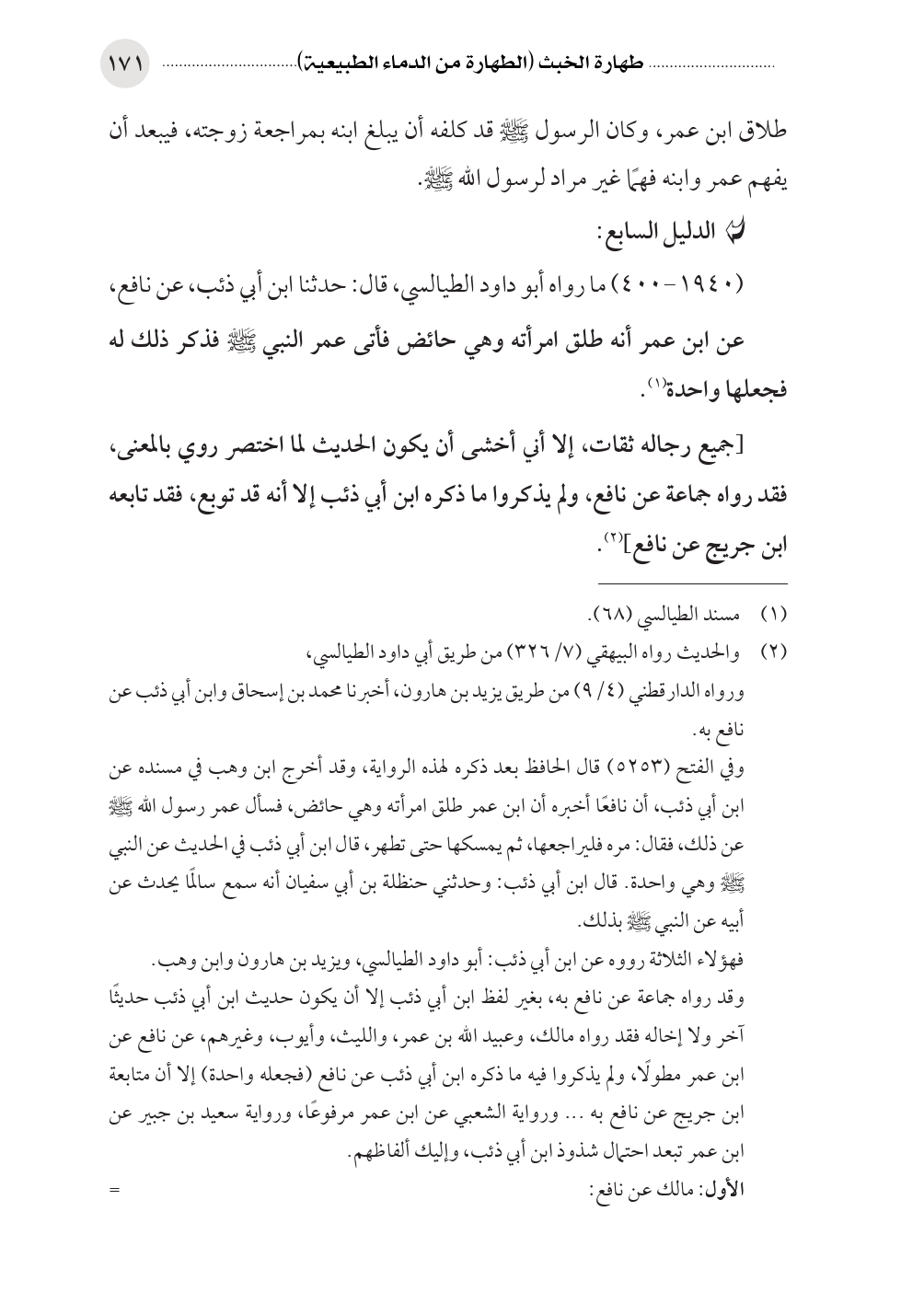 وفي الفتح (٥٢٥٣) قال الحافظ بعد ذكره لهذه الرواية، وقد أخرج ابن وهب في مسنده عن ابن أبي ذئب، أن نافعًا أخبره أن ابن عمر طلق امرأته وهي حائض، فسأل عمر رسول الله صلى الله عليه وسلم عن ذلك، فقال: مره فليراجعها، ثم يمسكها حتى تطهر، قال ابن أبي ذئب في الحديث عن النبي صلى الله عليه وسلم وهي واحدة. قال ابن أبي ذئب: وحدثني حنظلة بن أبي سفيان أنه سمع سالمًا يحدث عن أبيه عن النبي صلى الله عليه وسلم بذلك.
