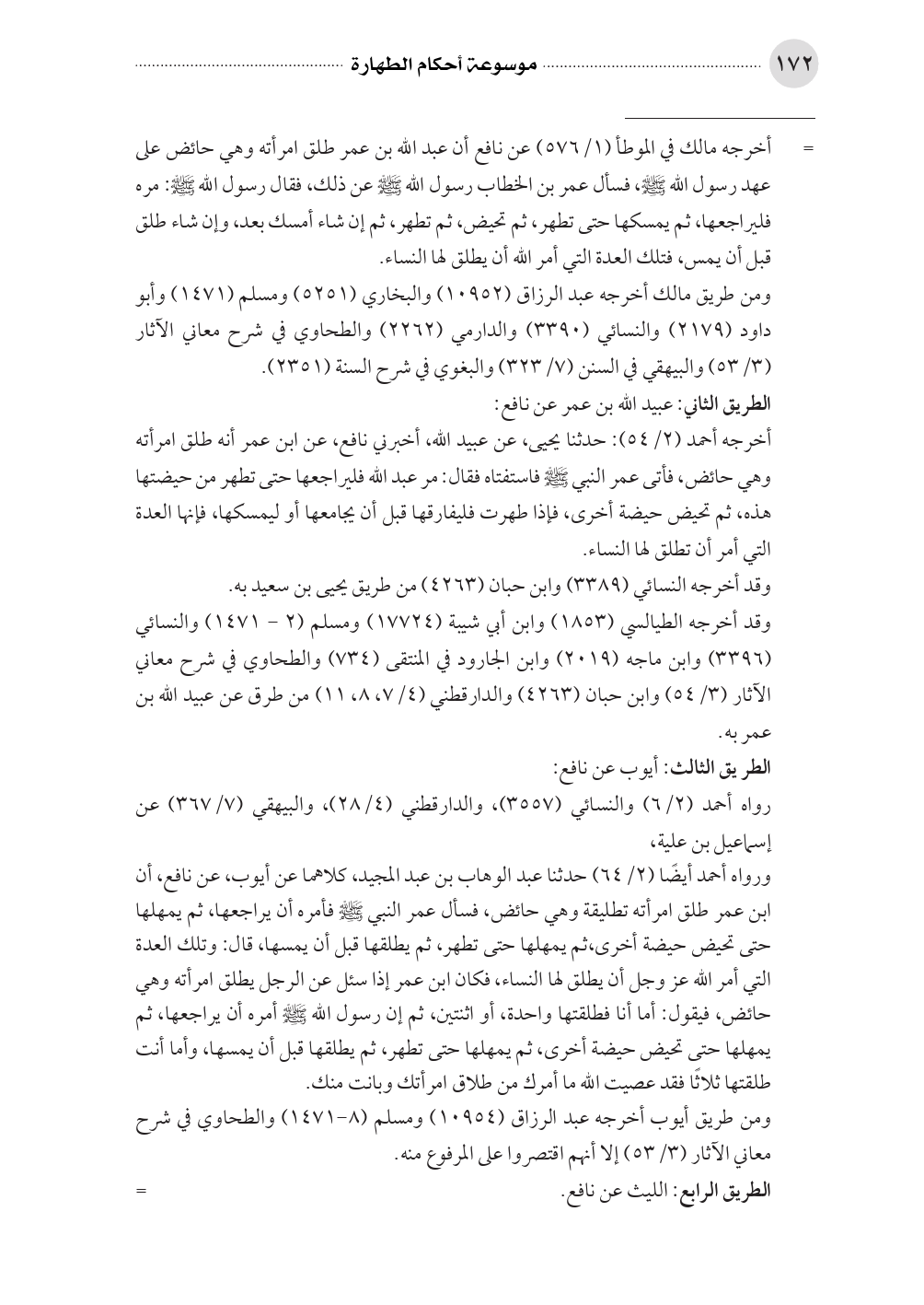 ورواه أحمد أيضًا (٢/ ٦٤) حدثنا عبد الوهاب بن عبد المجيد، كلاهما عن أيوب، عن نافع، أن ابن عمر طلق امرأته تطليقة وهي حائض، فسأل عمر النبي صلى الله عليه وسلم فأمره أن يراجعها، ثم يمهلها حتى تحيض حيضة أخرى، ثم يمهلها حتى تطهر، ثم يطلقها قبل أن يمسها، قال: وتلك العدة التي أمر الله عز وجل أن يطلق لها النساء، فكان ابن عمر إذا سئل عن الرجل يطلق امرأته وهي حائض، فيقول: أما أنا فطلقتها واحدة، أو اثنتين، ثم إن رسول الله صلى الله عليه وسلم أمره أن يراجعها، ثم يمهلها حتى تحيض حيضة أخرى، ثم يمهلها حتى تطهر، ثم يطلقها قبل أن يمسها، وأما أنت طلقتها ثلاثًا فقد عصيت الله ما أمرك من طلاق امرأتك وبانت منك.