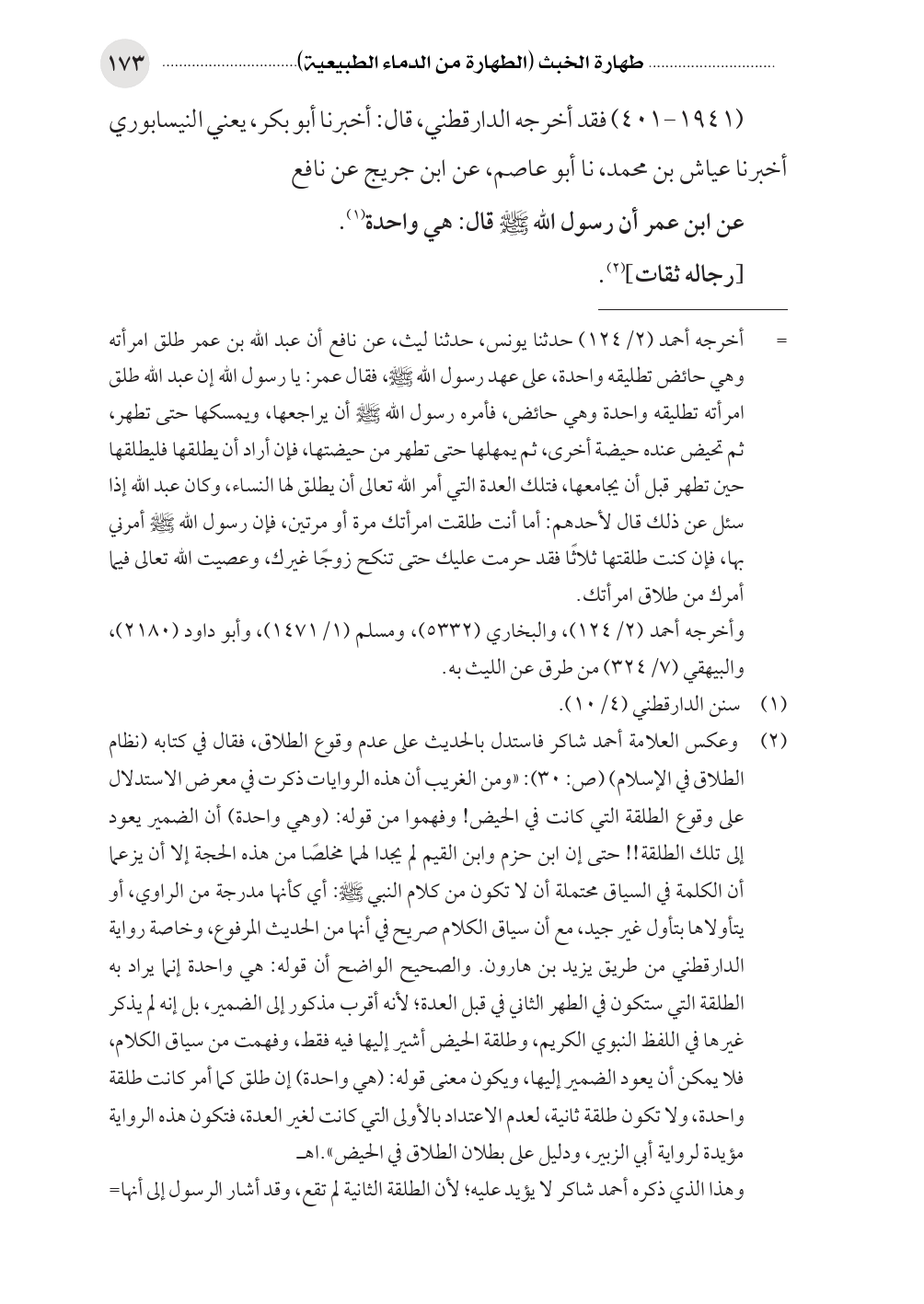 (¬٢) وعكس العلامة أحمد شاكر فاستدل بالحديث على عدم وقوع الطلاق، فقال في كتابه (نظام الطلاق في الإسلام) (ص: ٣٠): «ومن الغريب أن هذه الروايات ذكرت في معرض الاستدلال على وقوع الطلقة التي كانت في الحيض! وفهموا من قوله: (وهي واحدة) أن الضمير يعود إلى تلك الطلقة! ! حتى إن ابن حزم وابن القيم لم يجدا لهما مخلصًا من هذه الحجة إلا أن يزعما أن الكلمة في السياق محتملة أن لا تكون من كلام النبي صلى الله عليه وسلم: أي كأنها مدرجة من الراوي، أو يتأولاها بتأول غير جيد، مع أن سياق الكلام صريح في أنها من الحديث المرفوع، وخاصة رواية الدارقطني من طريق يزيد بن هارون. والصحيح الواضح أن قوله: هي واحدة إنما يراد به الطلقة التي ستكون في الطهر الثاني في قبل العدة؛ لأنه أقرب مذكور إلى الضمير، بل إنه لم يذكر غيرها في اللفظ النبوي الكريم، وطلقة الحيض أشير إليها فيه فقط، وفهمت من سياق الكلام، فلا يمكن أن يعود الضمير إليها، ويكون معنى قوله: (هي واحدة) إن طلق كما أمر كانت طلقة واحدة، ولا تكون طلقة ثانية، لعدم الاعتداد بالأولى التي كانت لغير العدة، فتكون هذه الرواية مؤيدة لرواية أبي الزبير، ودليل على بطلان الطلاق في الحيض».اهـ