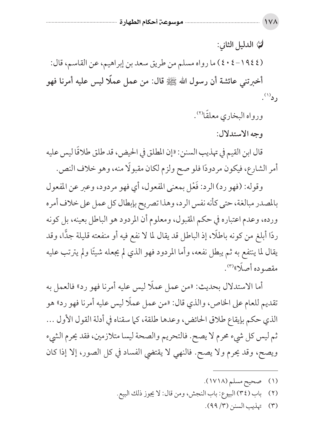 أما الاستدلال بحديث: «من عمل عملًا ليس عليه أمرنا فهو رد» فالعمل به تقديم للعام على الخاص، والذي قال: «من عمل عملًا ليس عليه أمرنا فهو رد» هو الذي حكم بإيقاع طلاق الحائض، وعدها طلقة، كما سقناه في أدلة القول الأول ... ثم ليس كل شيء محرم لا يصح. فالتحريم والصحة ليسا متلازمين، فقد يحرم الشيء ويصح، وقد يحرم ولا يصح. فالنهي لا يقتضي الفساد في كل الصور، إلا إذا كان
