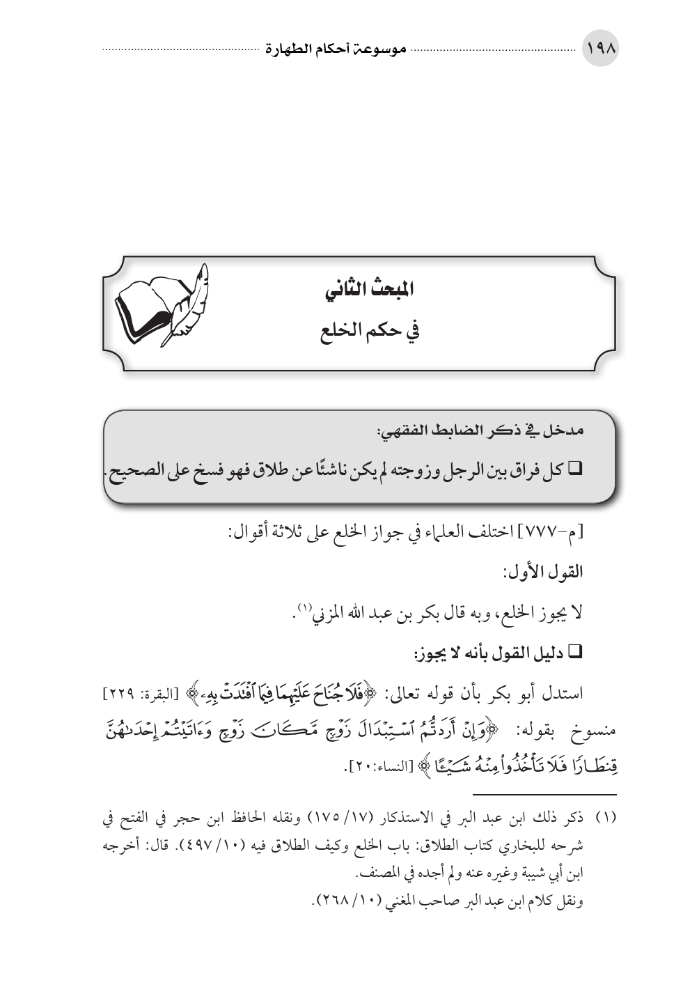 استدل أبو بكر بأن قوله تعالى: (فَلا جُنَاحَ عَلَيْهِمَا فِيمَا افْتَدَتْ بِهِ) [البقرة: ٢٢٩] منسوخ بقوله: (وَإِنْ أَرَدتُّمُ اسْتِبْدَالَ زَوْجٍ مَّكَانَ زَوْجٍ وَآتَيْتُمْ إِحْدَاهُنَّ قِنطَاراً فَلا تَأْخُذُوا مِنْهُ شَيْئاً) [النساء: ٢٠].