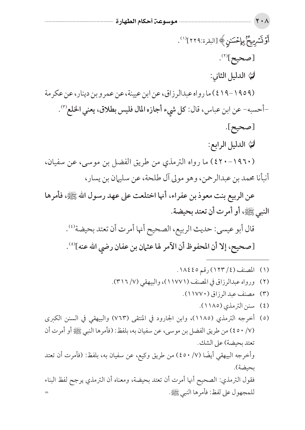 وكذلك رجح البيهقي، فإنه قال عقب رواية وكيع: «وهذا أصح، وليس فيه من أمرها، ولا على عهد النبي صلى الله عليه وسلم، وقد روينا في كتاب الخلع، أنها اختلعت من زوجها زمن عثمان بن عفان رضي الله عنه.