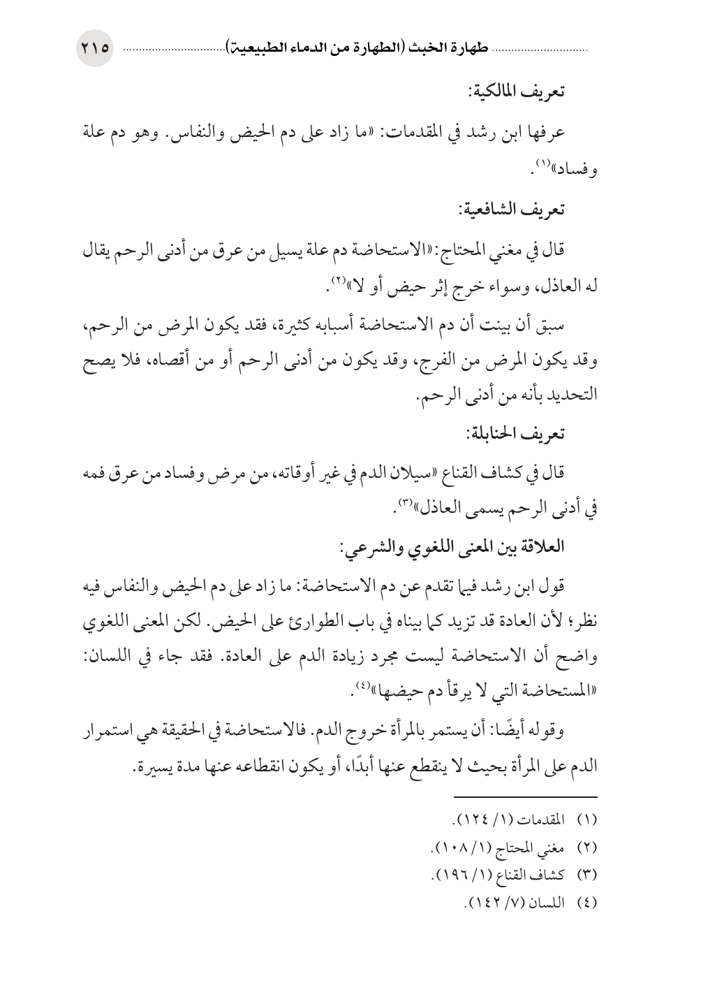 قول ابن رشد فيما تقدم عن دم الاستحاضة: ما زاد على دم الحيض والنفاس فيه نظر؛ لأن العادة قد تزيد كما بيناه في باب الطوارئ على الحيض. لكن المعنى اللغوي واضح أن الاستحاضة ليست مجرد زيادة الدم على العادة. فقد جاء في اللسان: «المستحاضة التي لا يرقأ دم حيضها» (¬٤).