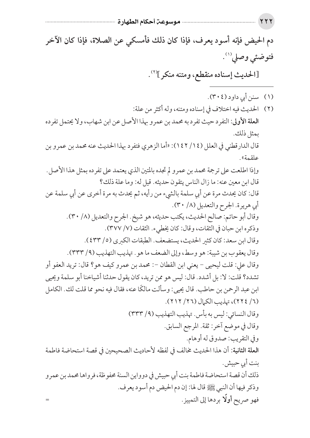 ذلك أن قصة استحاضة فاطمة بنت أبي حبيش في دوواين السنة محفوظة، فرواها محمد بن عمرو وذكر فيها أن النبي صلى الله عليه وسلم قال لها: إن دم الحيض دم أسود يعرف.