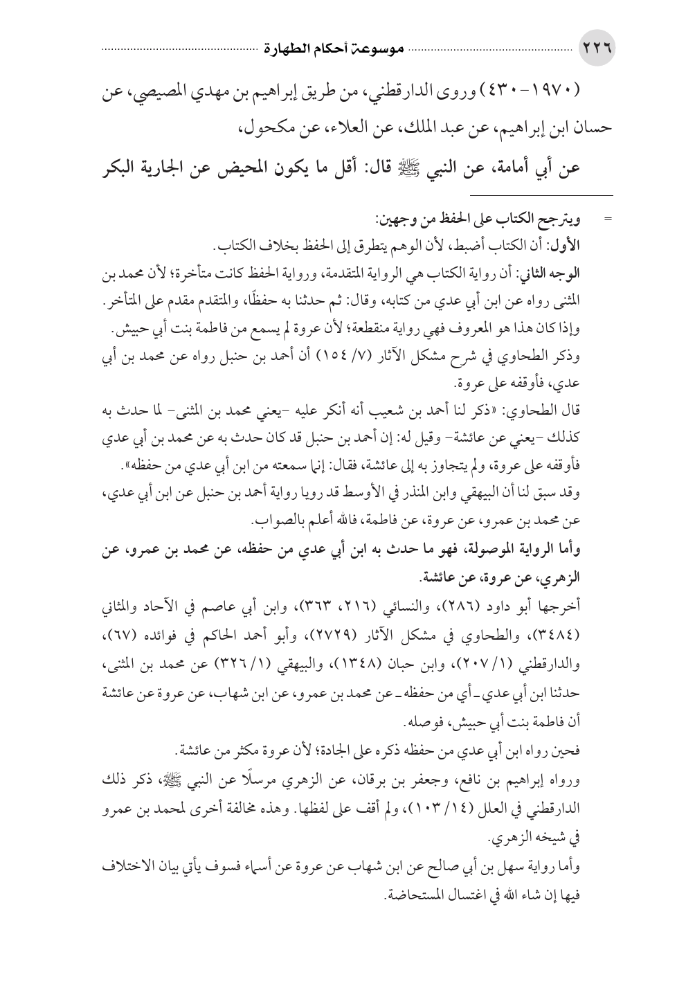الوجه الثاني: أن رواية الكتاب هي الرواية المتقدمة، ورواية الحفظ كانت متأخرة؛ لأن محمد بن المثنى رواه عن ابن أبي عدي من كتابه، وقال: ثم حدثنا به حفظًا، والمتقدم مقدم على المتأخر. وإذا كان هذا هو المعروف فهي رواية منقطعة؛ لأن عروة لم يسمع من فاطمة بنت أبي حبيش.