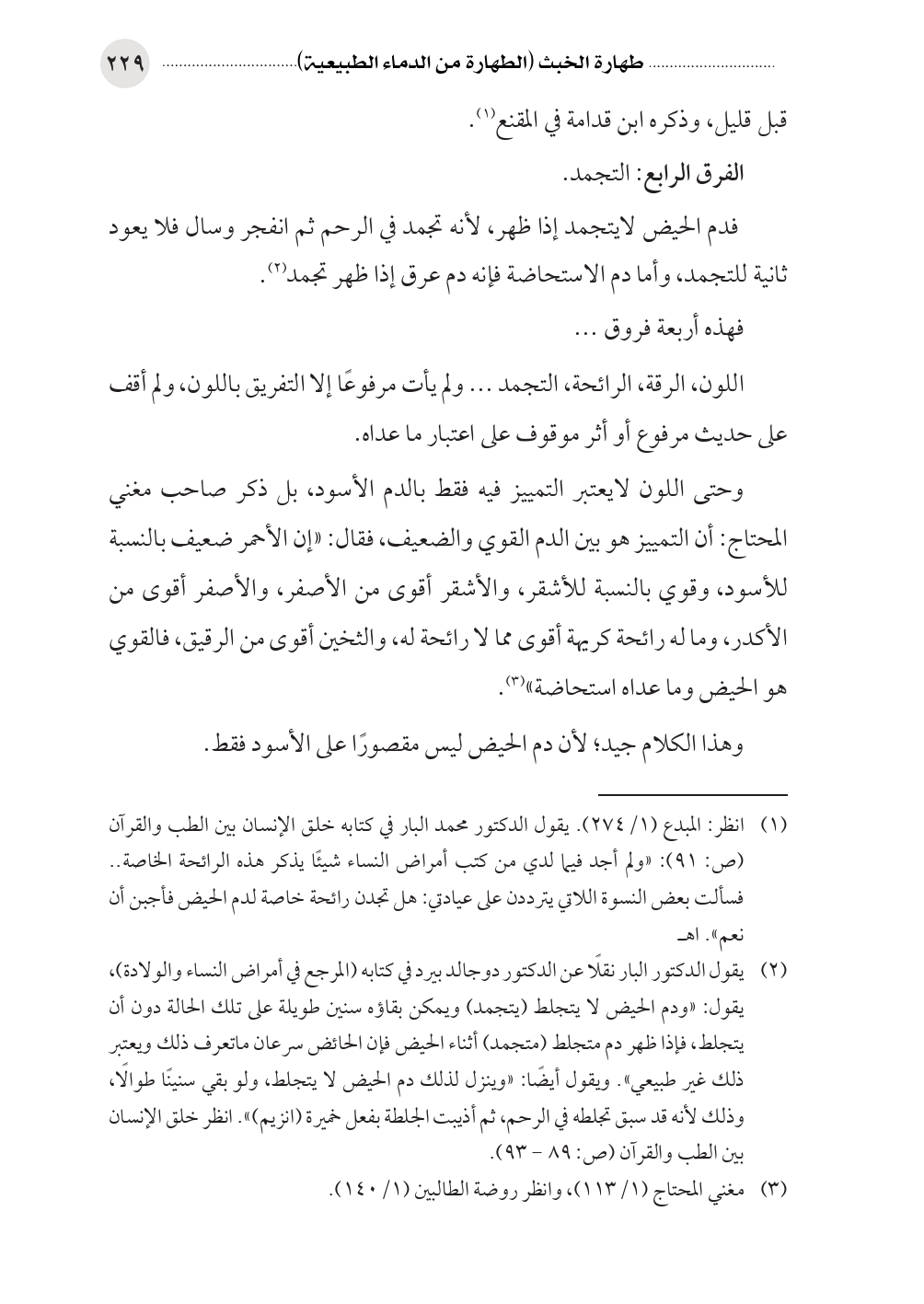 (¬٢) يقول الدكتور البار نقلًا عن الدكتور دوجالد بيرد في كتابه (المرجع في أمراض النساء والولادة)، يقول: «ودم الحيض لا يتجلط (يتجمد) ويمكن بقاؤه سنين طويلة على تلك الحالة دون أن يتجلط، فإذا ظهر دم متجلط (متجمد) أثناء الحيض فإن الحائض سرعان ماتعرف ذلك ويعتبر ذلك غير طبيعي». ويقول أيضًا: «وينزل لذلك دم الحيض لا يتجلط، ولو بقي سنينًا طوالًا، وذلك لأنه قد سبق تجلطه في الرحم، ثم أذيبت الجلطة بفعل خميرة (انزيم)». انظر خلق الإنسان بين الطب والقرآن (ص: ٨٩ - ٩٣).
