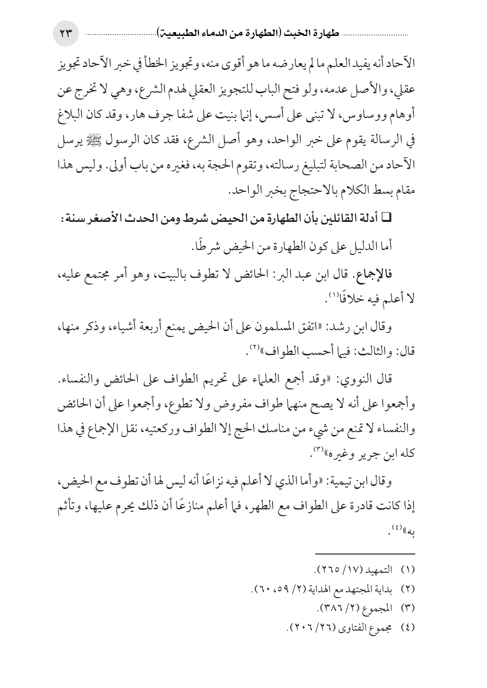 وقال ابن رشد: «اتفق المسلمون على أن الحيض يمنع أربعة أشياء، وذكر منها، قال: والثالث: فيما أحسب الطواف» (¬٢).