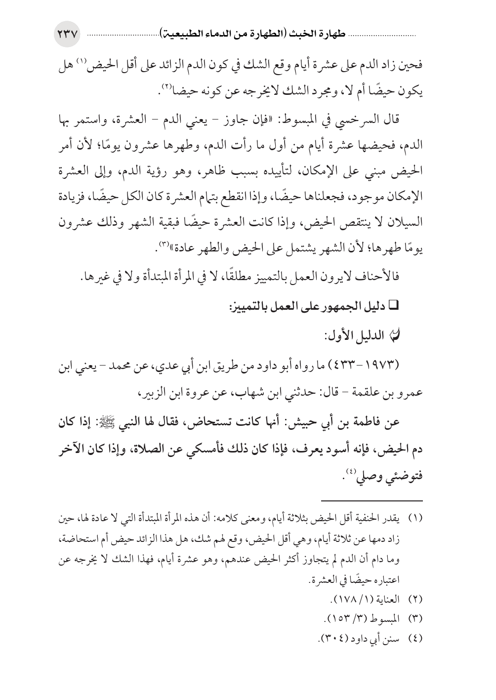 (¬١) يقدر الحنفية أقل الحيض بثلاثة أيام، ومعنى كلامه: أن هذه المرأة المبتدأة التي لا عادة لها، حين زاد دمها عن ثلاثة أيام، وهي أقل الحيض، وقع لهم شك، هل هذا الزائد حيض أم استحاضة، وما دام أن الدم لم يتجاوز أكثر الحيض عندهم، وهو عشرة أيام، فهذا الشك لا يخرجه عن اعتباره حيضًا في العشرة.