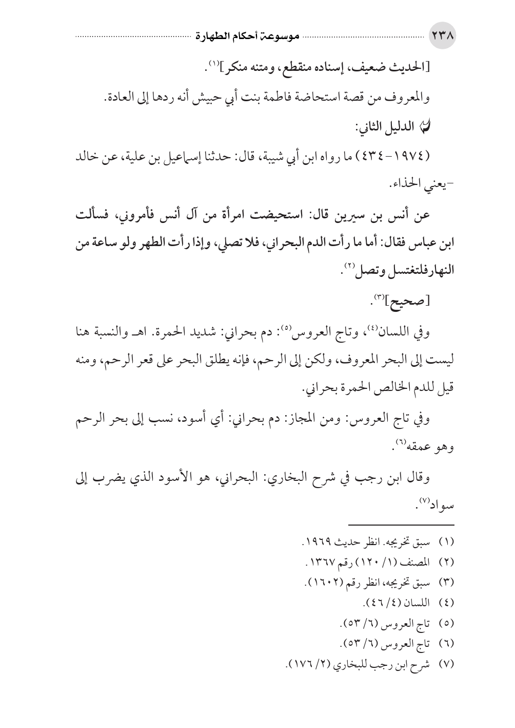 وفي اللسان (¬٤)، وتاج العروس (¬٥): دم بحراني: شديد الحمرة. اهـ والنسبة هنا ليست إلى البحر المعروف، ولكن إلى الرحم، فإنه يطلق البحر على قعر الرحم، ومنه قيل للدم الخالص الحمرة بحراني.