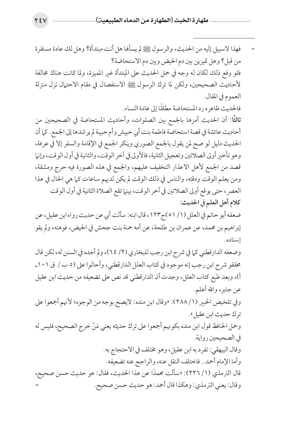 = فهذا لاسبيل إليه من الحديث، والرسول صلى الله عليه وسلم لم يسألها هل أنت مبتدأة؟ وهل لك عادة مستقرة من قبل؟ وهل تميزين بين دم الحيض وبين دم الاستحاضة؟