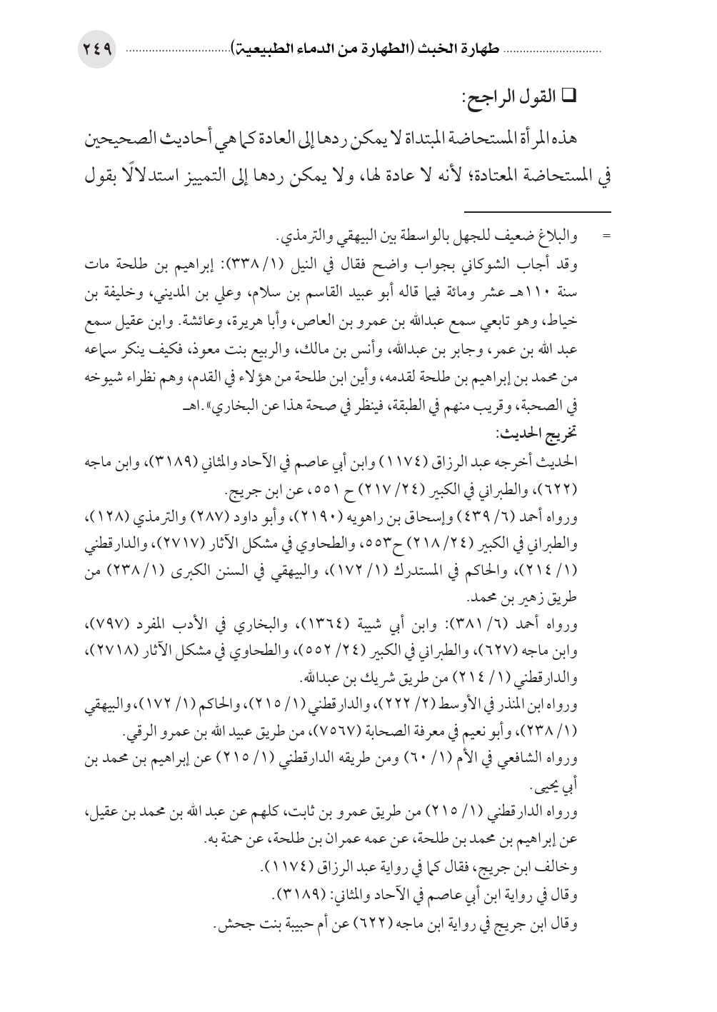 ورواه الدارقطني (١/ ٢١٥) من طريق عمرو بن ثابت، كلهم عن عبد الله بن محمد بن عقيل، عن إبراهيم بن محمد بن طلحة، عن عمه عمران بن طلحة، عن حمنة به.