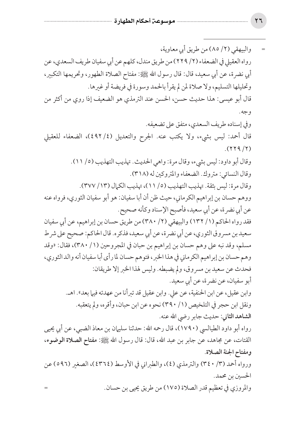 رواه العقيلي في الضعفاء (٢/ ٢٢٩) من طريق مندل، كلهم عن أبي سفيان طريف السعدي، عن أبي نضرة، عن أبي سعيد، قال: قال رسول الله صلى الله عليه وسلم: مفتاح الصلاة الطهور، وتحريمها التكبير، وتحليلها التسليم، ولا صلاة لمن لم يقرأ بالحمد وسورة في فريضة أو غيرها.