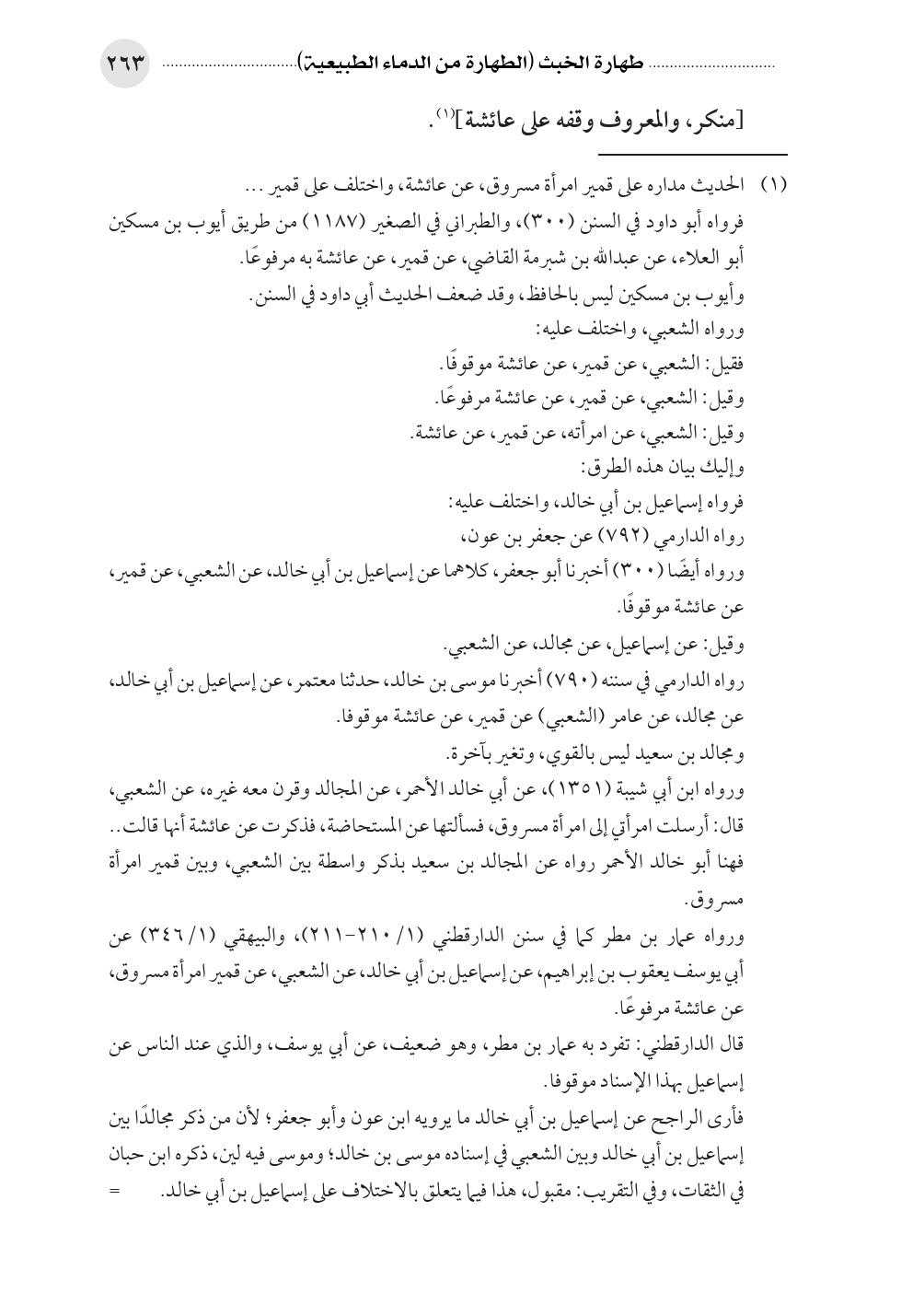 ورواه ابن أبي شيبة (١٣٥١)، عن أبي خالد الأحمر، عن المجالد وقرن معه غيره، عن الشعبي، قال: أرسلت امرأتي إلى امرأة مسروق، فسألتها عن المستحاضة، فذكرت عن عائشة أنها قالت ..