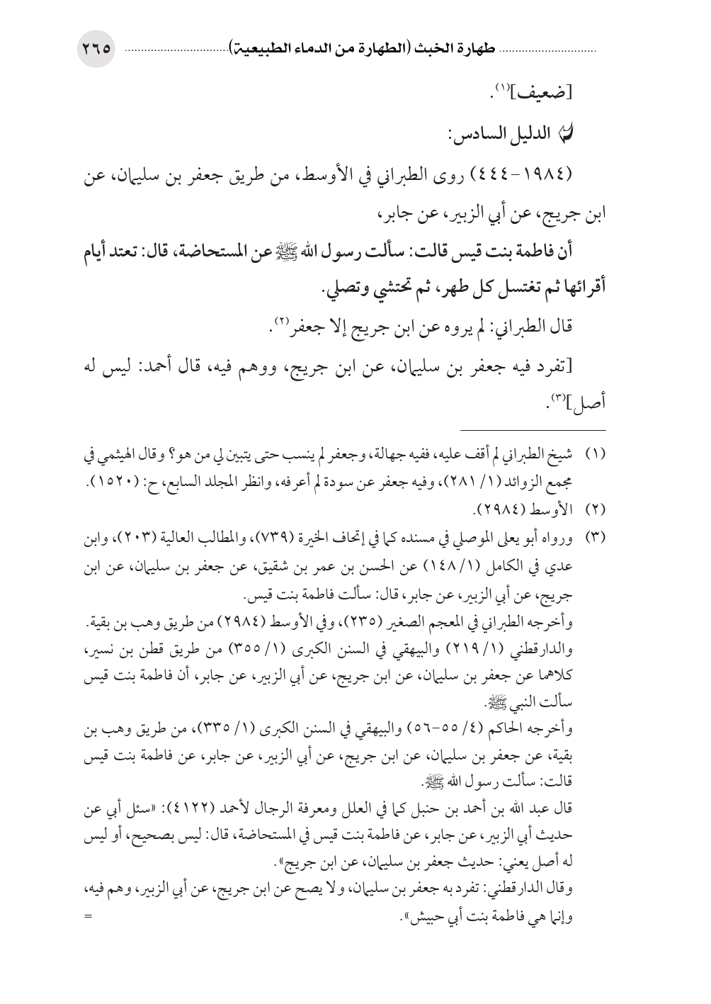 وقال الدارقطني: تفرد به جعفر بن سليمان، ولا يصح عن ابن جريج، عن أبي الزبير، وهم فيه، وإنما هي فاطمة بنت أبي حبيش». ...