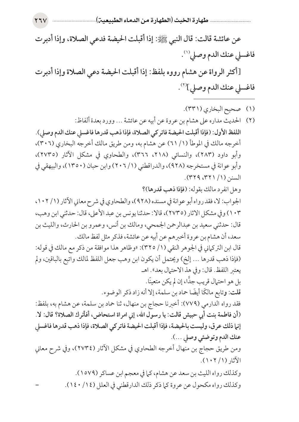عن عائشة قالت: قال النبي صلى الله عليه وسلم: إذا أقبلت الحيضة فدعي الصلاة، وإذا أدبرت فاغسلي عنك الدم وصلي (¬١).