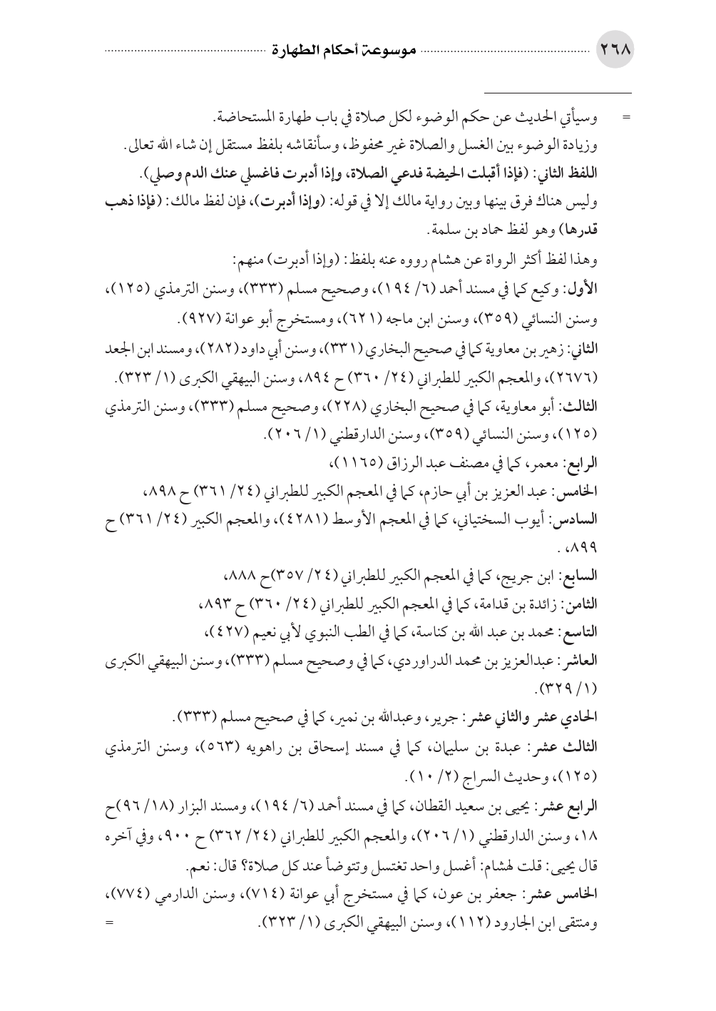 الرابع عشر: يحيى بن سعيد القطان، كما في مسند أحمد (٦/ ١٩٤)، ومسند البزار (١٨/ ٩٦) ح ١٨، وسنن الدارقطني (١/ ٢٠٦)، والمعجم الكبير للطبراني (٢٤/ ٣٦٢) ح ٩٠٠، وفي آخره قال يحيى: قلت لهشام: أغسل واحد تغتسل وتتوضأ عند كل صلاة؟ قال: نعم.