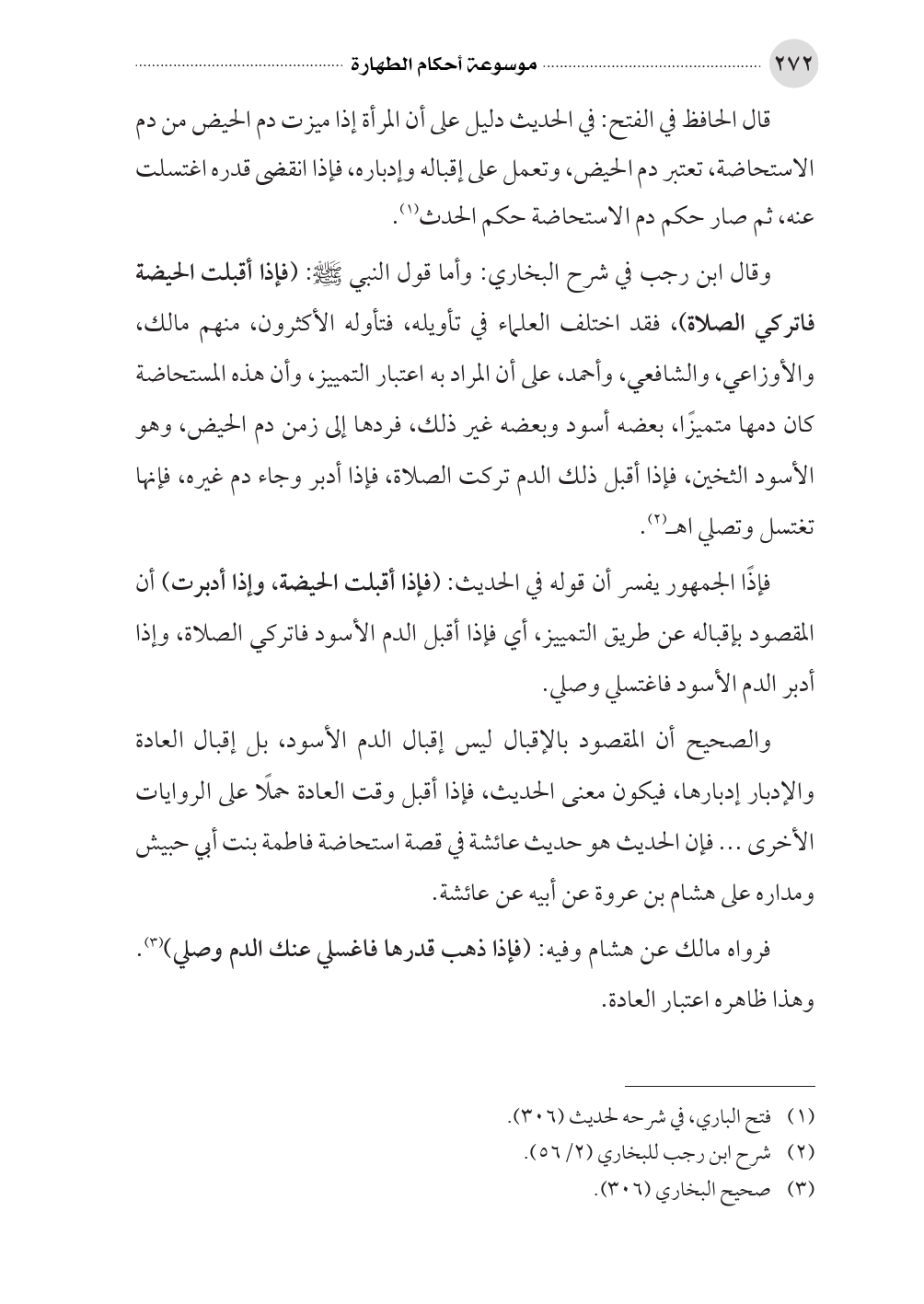وقال ابن رجب في شرح البخاري: وأما قول النبي صلى الله عليه وسلم: (فإذا أقبلت الحيضة فاتركي الصلاة)، فقد اختلف العلماء في تأويله، فتأوله الأكثرون، منهم مالك، والأوزاعي، والشافعي، وأحمد، على أن المراد به اعتبار التمييز، وأن هذه المستحاضة كان دمها متميزًا، بعضه أسود وبعضه غير ذلك، فردها إلى زمن دم الحيض، وهو الأسود الثخين، فإذا أقبل ذلك الدم تركت الصلاة، فإذا أدبر وجاء دم غيره، فإنها تغتسل وتصلي اهـ (¬٢).