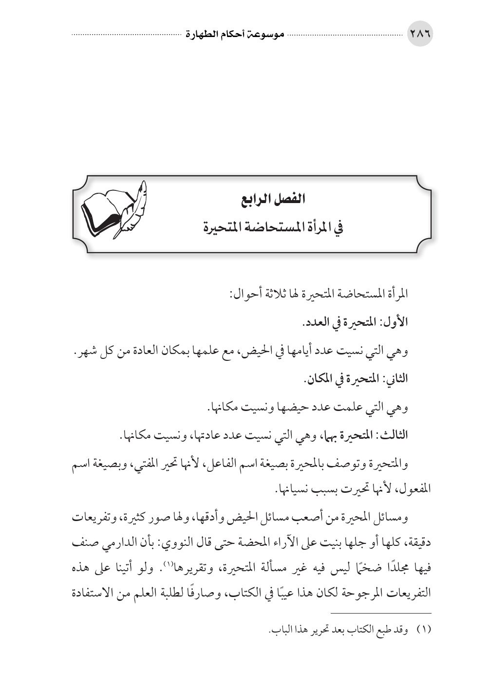 ومسائل المحيرة من أصعب مسائل الحيض وأدقها، ولها صور كثيرة، وتفريعات دقيقة، كلها أو جلها بنيت على الآراء المحضة حتى قال النووي: بأن الدارمي صنف فيها مجلدًا ضخمًا ليس فيه غير مسألة المتحيرة، وتقريرها (¬١). ولو أتينا على هذه التفريعات المرجوحة لكان هذا عيبًا في الكتاب، وصارفًا لطلبة العلم من الاستفادة