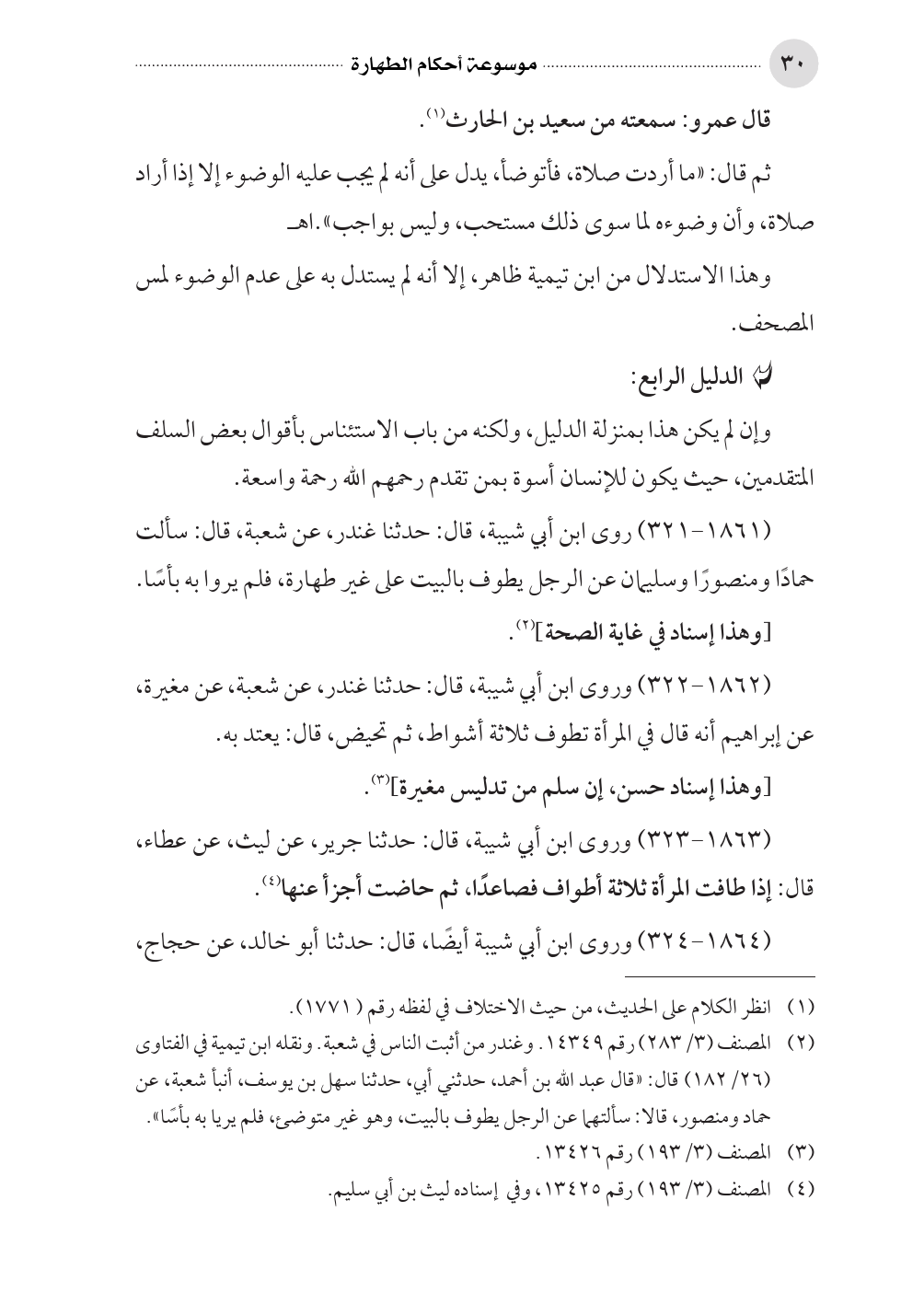 (١٨٦١ - ٣٢١) روى ابن أبي شيبة، قال: حدثنا غندر، عن شعبة، قال: سألت حمادًا ومنصورًا وسليمان عن الرجل يطوف بالبيت على غير طهارة، فلم يروا به بأسًا.