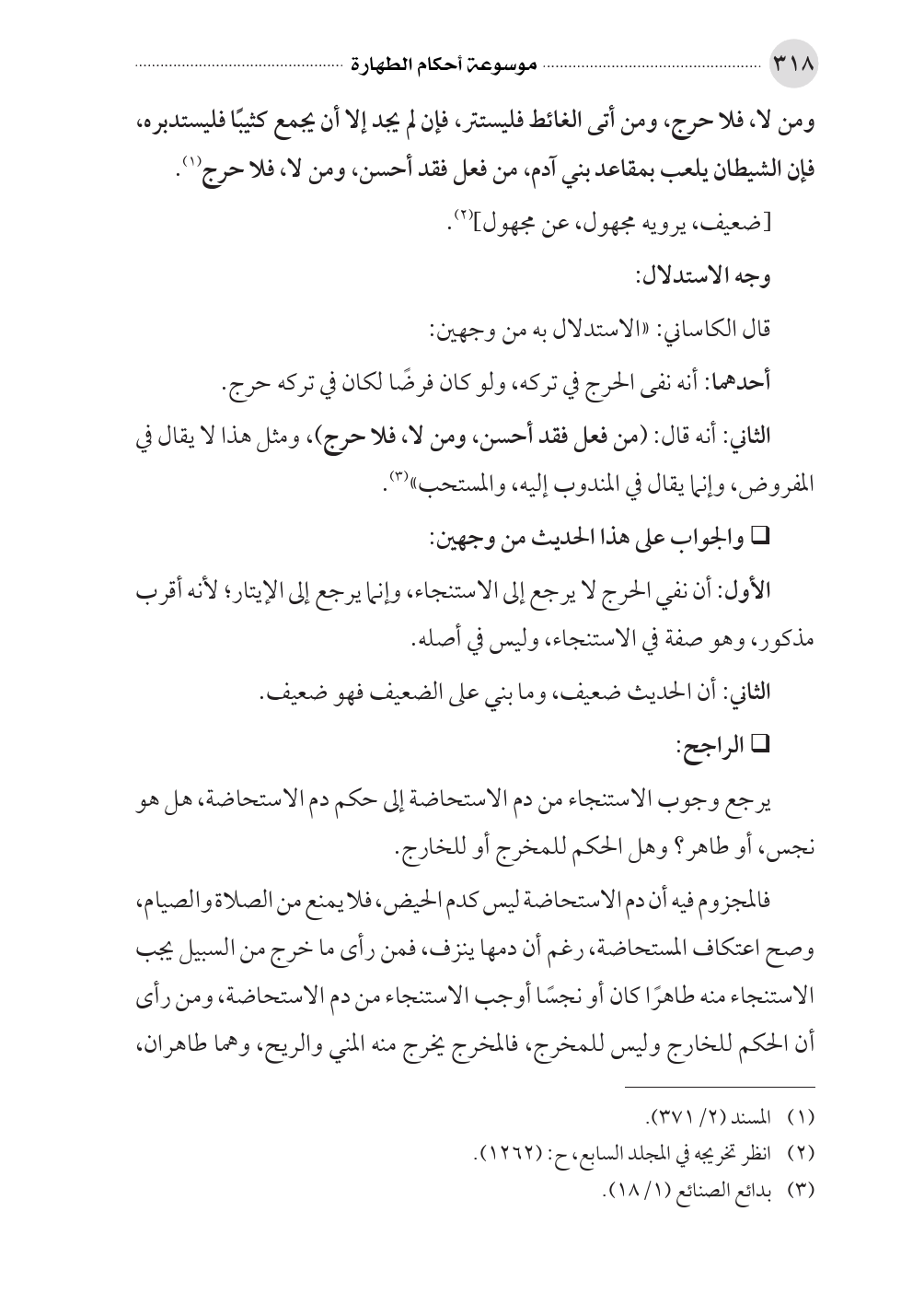 فالمجزوم فيه أن دم الاستحاضة ليس كدم الحيض، فلا يمنع من الصلاة والصيام، وصح اعتكاف المستحاضة، رغم أن دمها ينزف، فمن رأى ما خرج من السبيل يجب الاستنجاء منه طاهرًا كان أو نجسًا أوجب الاستنجاء من دم الاستحاضة، ومن رأى أن الحكم للخارج وليس للمخرج، فالمخرج يخرج منه المني والريح، وهما طاهران،