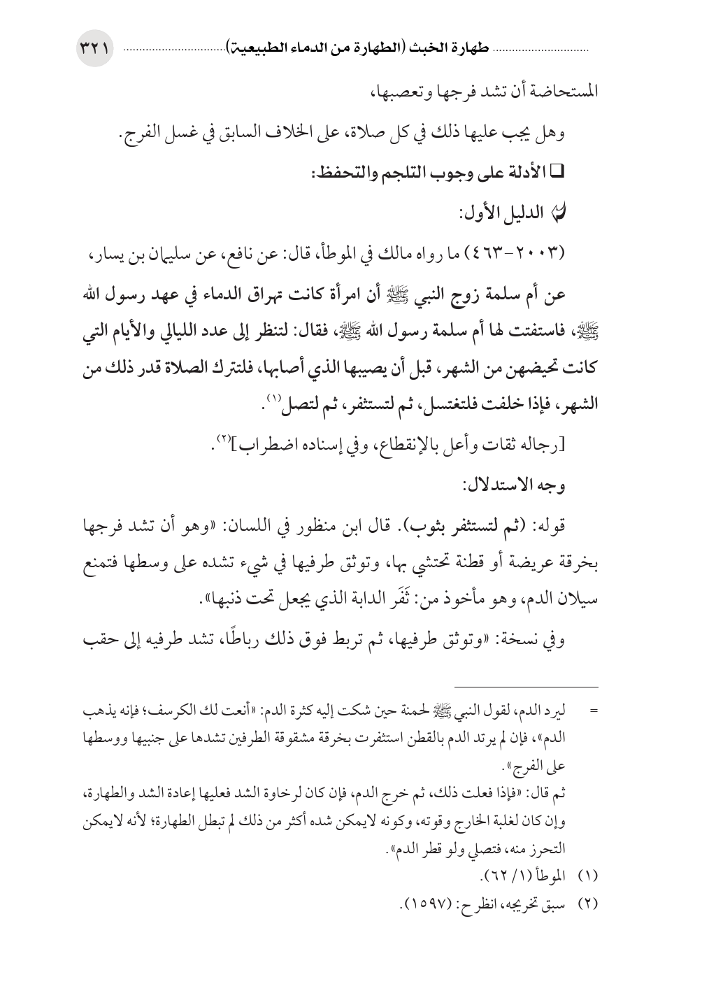 عن أم سلمة زوج النبي صلى الله عليه وسلم أن امرأة كانت تهراق الدماء في عهد رسول الله صلى الله عليه وسلم، فاستفتت لها أم سلمة رسول الله صلى الله عليه وسلم، فقال: لتنظر إلى عدد الليالي والأيام التي كانت تحيضهن من الشهر، قبل أن يصيبها الذي أصابها، فلتترك الصلاة قدر ذلك من الشهر، فإذا خلفت فلتغتسل، ثم لتستثفر، ثم لتصل (¬١).