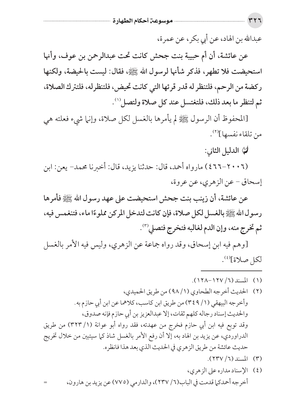 عن عائشة، أن أم حبيبة بنت جحش كانت تحت عبدالرحمن بن عوف، وأنها استحيضت فلا تطهر، فذكر شأنها لرسول الله صلى الله عليه وسلم، فقال: ليست بالحيضة، ولكنها ركضة من الرحم، فلتنظر له قدر قرئها التي كانت تحيض، فلتنظرله، فلتترك الصلاة، ثم لتنظر ما بعد ذلك، فلتغتسل عند كل صلاة ولتصل (¬١).